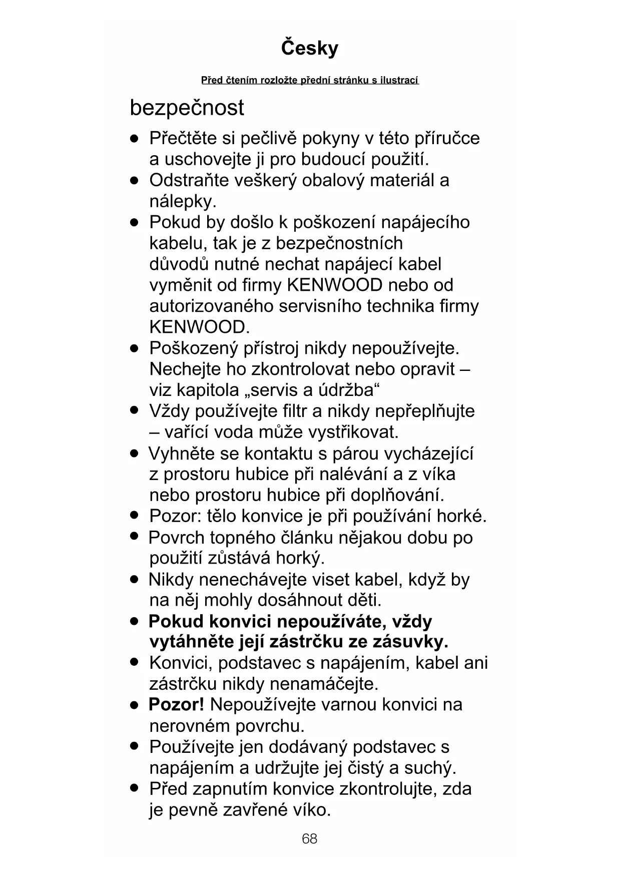 Před zapnutím konvice zkontrolujte, zda je pevně zavřené víko. P¡ed ïtením rozlo¥te p¡ední stránku s ilustrací Ïesky69 English