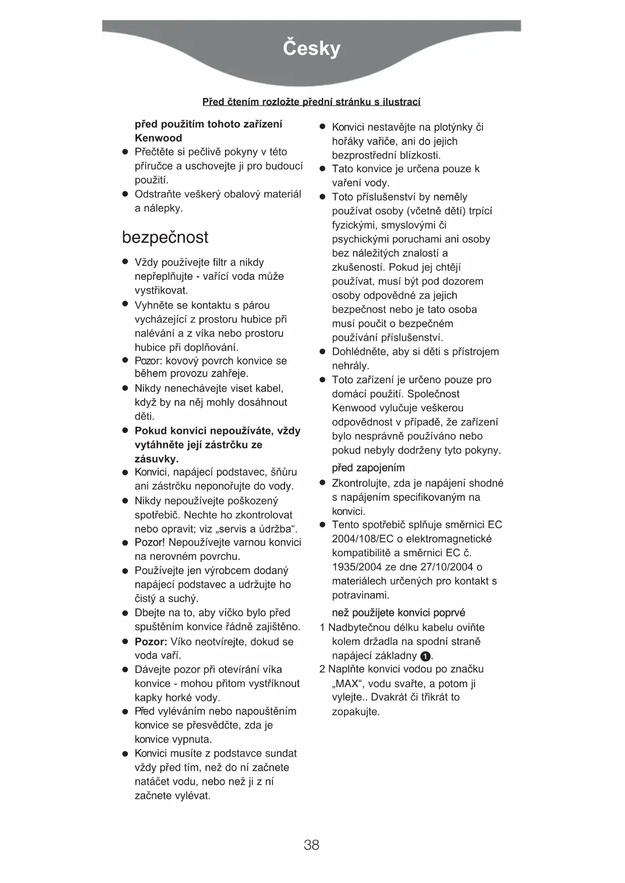 Tento spotřebič splňuje směrnici EC 2004/108/EC o elektromagnetické kompatibilitě a směrnici EC č. 1935/2004 ze dne 27/10/2004 o materiálech určených pro kontakt s potravinami. nneežž ppoouužžiijjeettee kkoonnvviiccii ppoopprrvvéé 1 Nadbytečnou délku kabelu oviňte kolem držadla na spodní straně napájecí základny . 2 Naplňte konvici vodou po značku „MAX“, vodu svařte, a potom ji vylejte.. Dvakrát ïi t¡ikrát to zopakujte.