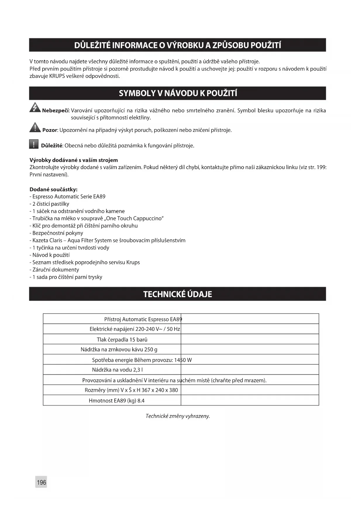 DŮLEŽITÁ UPOZORNĚNÍ ..................................................................................................p. 200 PŘÍMÁ PŘÍPRAVA KÁVOVÝCH NÁPOJŮ ..............................................................................p. 201 PŘÍMÁ PŘÍPRAVA MLÉČNÝCH NÁPOJŮ ..............................................................................p. 201 PŘÍPRAVA ČAJE. . . . . . . . . . . . . . . . . . . . . . . . . . . . . . . . . . . . . . . . . . . . . . . . . . . . . . . . . . . . . . . . . . . . . . . . . . . . . . . . . . . . . . . . . . . . . . . . . . . . . . . . . . . . . . . . p. 202 PŘÍPRAVA DALŠÍCH NÁPOJŮ: RISTRETTO, DOPPIO, AMERICANO NEBO MLÉČNÁ PĚNA ....................................................................................p. 202 DALŠÍ FUNKCE .................................................................................................................p. 203 CELKOVÁ ÚDRŽBA ...........................................................................................................p. 204 PROBLÉMY A NÁPRAVNÉ AKCE .........................................................................................p. 206196 DŮLEŽITÉ INFORMACE O VÝROBKU A ZPŮSOBU POUŽITÍ V tomto návodu najdete všechny důležité informace o spuštění, použití a údržbě vašeho přístroje. Před prvním použitím přístroje si pozorně prostudujte návod k použití a uschovejte jej: použití v rozporu s návodem k použití zbavuje KRUPS veškeré odpovědnosti. SYMBOLY V NÁVODU K POUŽITÍ Nebezpečí: Varování upozorňující na rizika vážného nebo smrtelného zranění. Symbol blesku upozorňuje na rizika související s přítomností elektřiny. Pozor: Upozornění na případný výskyt poruch, poškození nebo zničení přístroje.