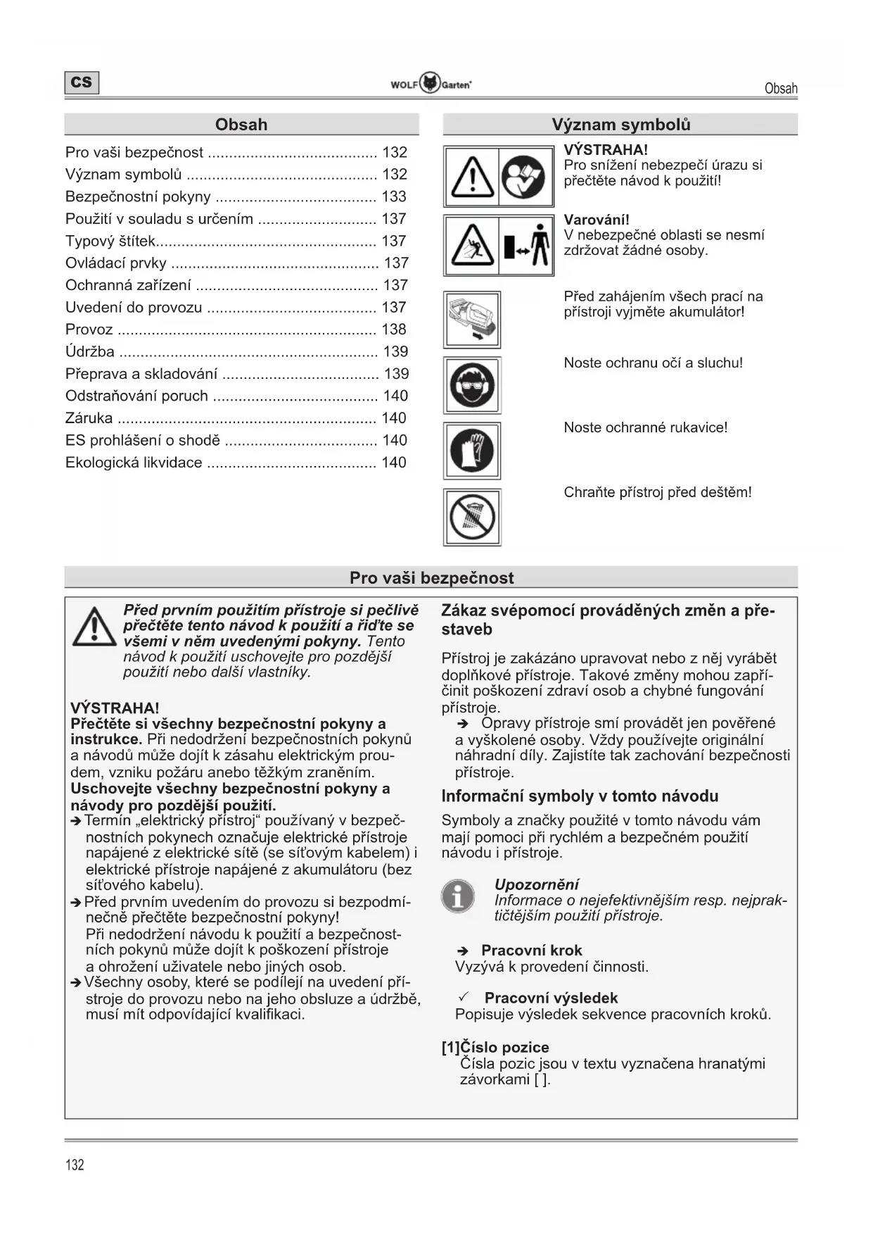 - Ekologická likvidace Význam symbolů VÝSTRAHA! Pro snížení nebezpečí úrazu si přečtěte návod k použití! Varování! V nebezpečné oblasti se nesmí zdržovat žádné osoby. Před zahájením všech prací na přístroji vyjměte akumulátor! Noste ochranu očí a sluchu! Noste ochranné rukavice! Chraňte přístroj před deštěm! Pro vaši bezpečnostPro vaši bezpečnost p. 140