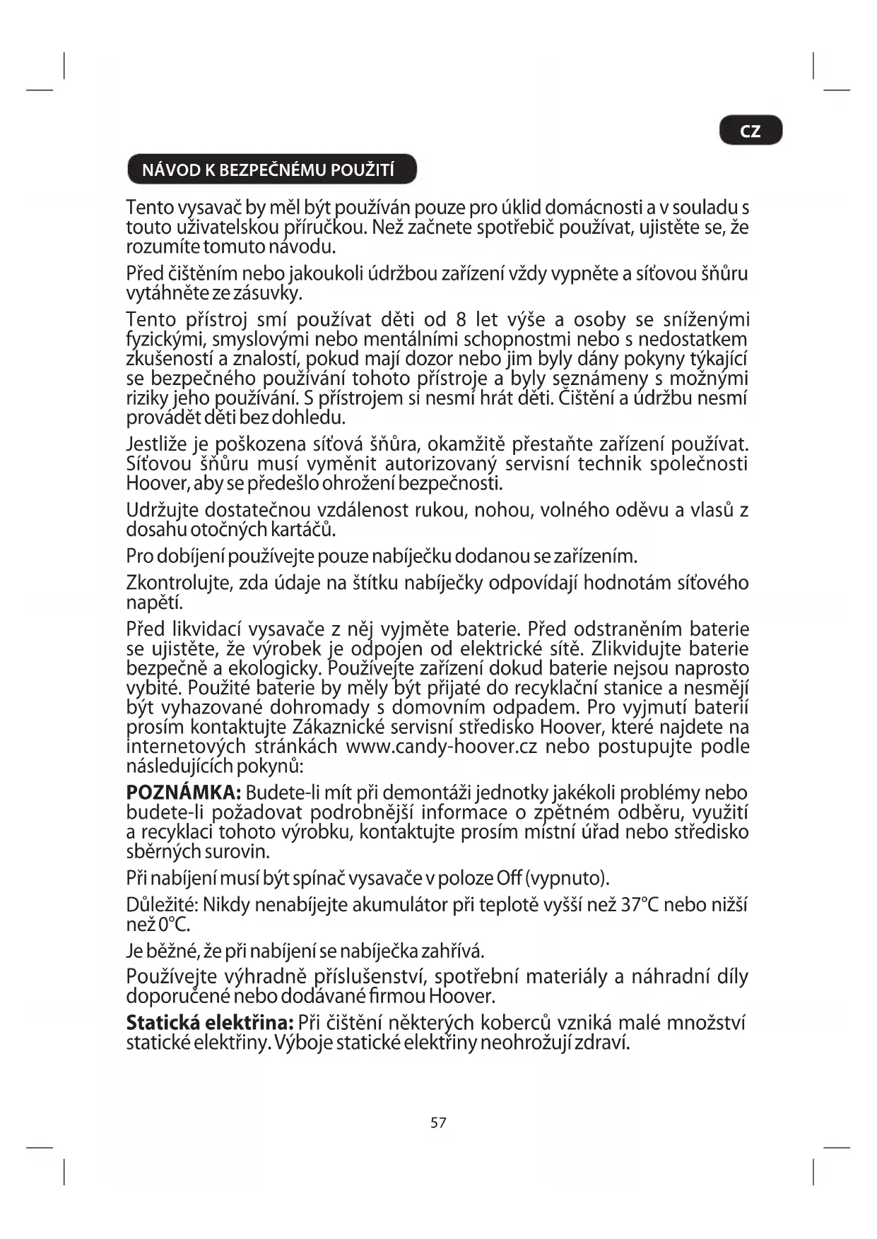 Před likvidací vysavače vyjměte baterii. Použité baterie by měly být přijaté do recyklační stanice a nesmějí být vyhazované dohromady s domovním odpadem. Pro vyjmutí baterií prosím kontaktujte Zákaznické servisní středisko Hoover nebo postupujte podle následujících pokynů: Před vyjmutím je nutno baterii zcela vybít. Ujistěte se, že nabíječka je odpojena od elektrické sítě.