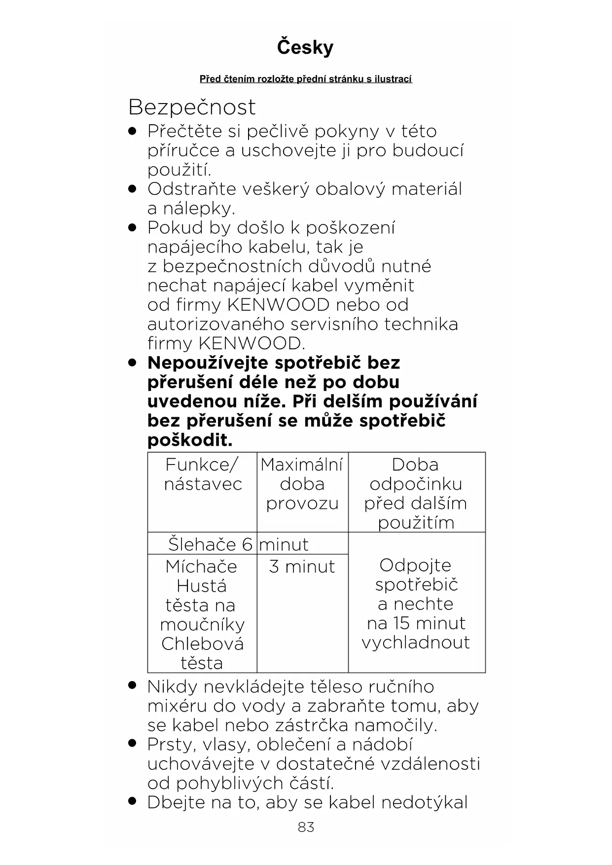 Toto zařízení je určeno pouze pro domácí použití. Společnost Kenwood vylučuje veškerou odpovědnost v případě, že zařízení bylo nesprávně používáno nebo pokud nebyly dodrženy tyto pokyny.85 Před prvním použitím ručního mixéru