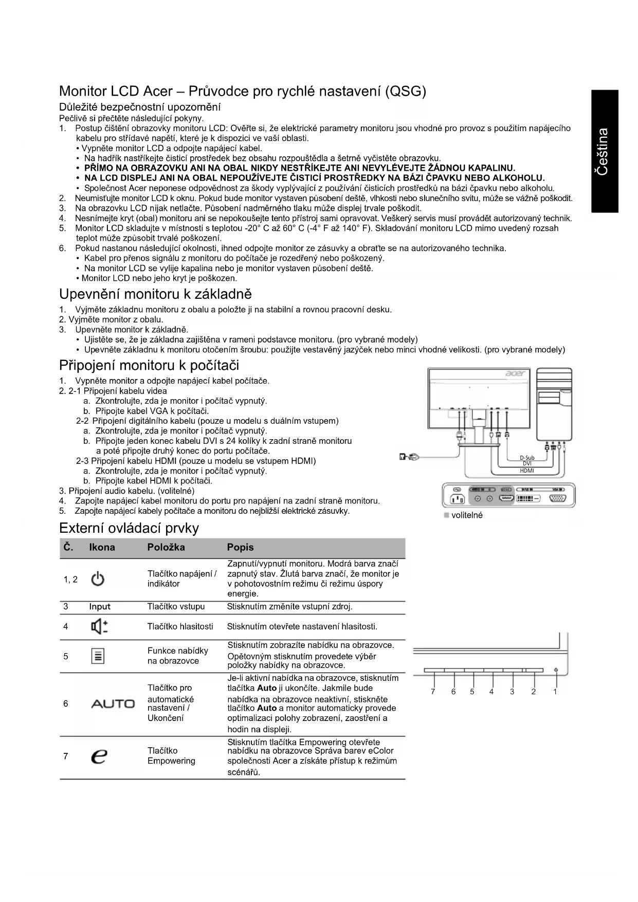 仕様は予告 な し に 変更 さ れ る こ と が あ り ま す。Čeština Monitor LCD Acer – Průvodce pro rychlé nastavení (QSG) Důležité bezpečnostní upozornění Pečlivě si přečtěte následující pokyny. 1. Postup čištění obrazovky monitoru LCD: Ověřte si, že elektrické parametry monitoru jsou vhodné pro provoz s použitím napájecího kabelu pro střídavé napětí, které je k dispozici ve vaší oblasti.