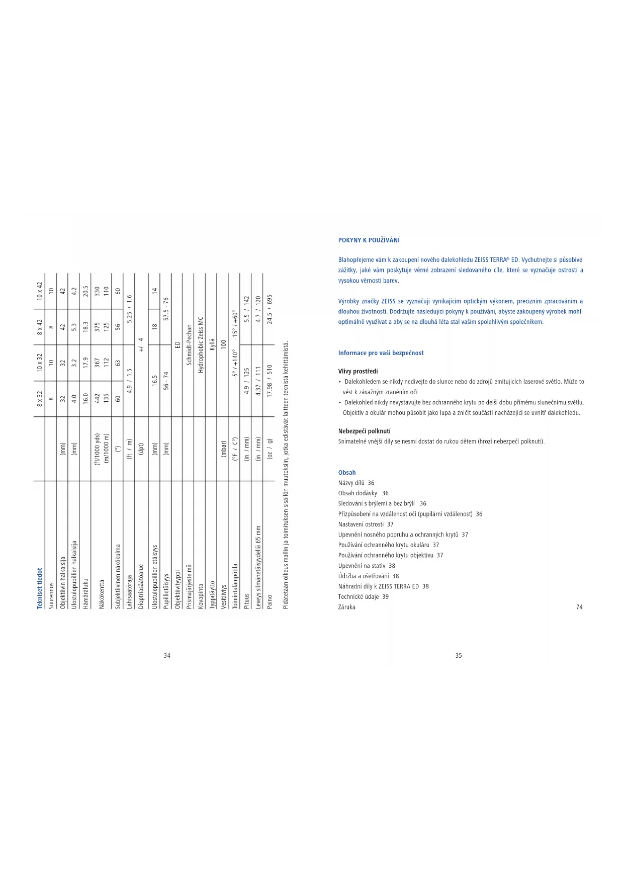 ED. Vychutnejte si působivé zážitky, jaké vám poskytuje věrné zobrazení sledovaného cíle, které se vyznačuje ostrostí a vysokou věrností barev. Výrobky značky ZEISS se vyznačují vynikajícím optickým výkonem, precizním zpracováním a dlouhou životností. Dodržujte následující pokyny k používání, abyste zakoupený výrobek mohli optimálně využívat a aby se na dlouhá léta stal vaším spolehlivým společníkem. Informace pro vaši bezpečnost Vlivy prostředí Dalekohledem se nikdy nedívejte do slunce nebo do zdrojů emitujících laserové světlo. Může to vést k závažným zraněním očí. Dalekohled nikdy nevystavujte bez ochranného krytu po delší dobu přímému slunečnímu světlu. Objektiv a okulár mohou působit jako lupa a zničit součásti nacházející se uvnitř dalekohledu. Nebezpečí polknutí Snímatelné vnější díly se nesmí dostat do rukou dětem (hrozí nebezpečí polknutí). Obsah Názvy dílů 36 Obsah dodávky 36 Sledování s brýlemi a bez brýlí 36 Přizpůsobení na vzdálenost očí (pupilární vzdálenost) 36 Nastavení ostrosti 37 Upevnění nosného popruhu a ochranných krytů 37 Používání ochranného krytu okuláru 37 Používání ochranného krytu objektivu 37 Upevnění na stativ 38 Údržba a ošetřování 38 Náhradní díly k ZEISS TERRA ED 38 Technické údaje 39 Záruka 74 Tekniset tiedot 8 x 32 10 x 32 8 x 42 10 x 42 Suurennos 8 10 8 10 Objektiivin halkaisija (mm) 32 32 42 42 Ulostulopupillien halkaisija (mm) 4.0 3.2 5.3 4.2 Hämäräluku 16.0 17.9 18.3 20.5 Näkökenttä (ft/1000 yds) (m/1000 m)
