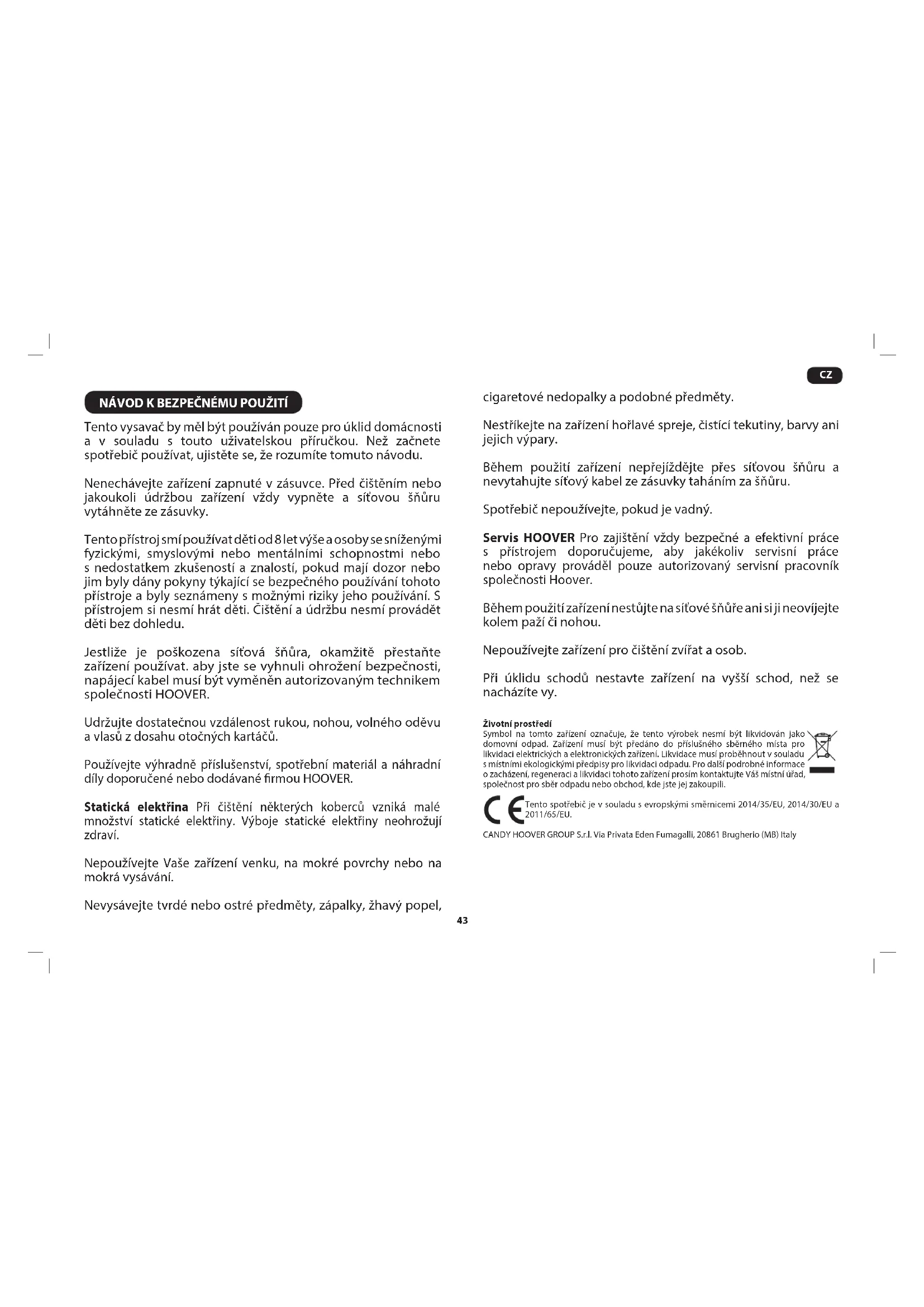 NÁVOD K BEZPEČNÉMU POUŽITÍ Tento vysavač by měl být používán pouze pro úklid domácnosti a v souladu s touto uživatelskou příručkou. Než začnete spotřebič používat, ujistěte se, že rozumíte tomuto návodu. Nenechávejte zařízení zapnuté v zásuvce. Před čištěním nebo jakoukoli údržbou zařízení vždy vypněte a síťovou šňůru vytáhněte ze zásuvky. Tento přístroj smí používat děti od 8 let výše a osoby se sníženými fyzickými, smyslovými nebo mentálními schopnostmi nebo s nedostatkem zkušeností a znalostí, pokud mají dozor nebo jim byly dány pokyny týkající se bezpečného používání tohoto přístroje a byly seznámeny s možnými riziky jeho používání. S přístrojem si nesmí hrát děti. Čištění a údržbu nesmí provádět děti bez dohledu. Jestliže je poškozena síťová šňůra, okamžitě přestaňte zařízení používat. aby jste se vyhnuli ohrožení bezpečnosti, napájecí kabel musí být vyměněn autorizovaným technikem společnosti HOOVER. Udržujte dostatečnou vzdálenost rukou, nohou, volného oděvu a vlasů z dosahu otočných kartáčů. Používejte výhradně příslušenství, spotřební materiál a náhradní díly doporučené nebo dodávané rmou HOOVER. Statická elektřina Při čištění některých koberců vzniká malé množství statické elektřiny. Výboje statické elektřiny neohrožují zdraví. Nepoužívejte Vaše zařízení venku, na mokré povrchy nebo na mokrá vysávání. Nevysávejte tvrdé nebo ostré předměty, zápalky, žhavý popel, cigaretové nedopalky a podobné předměty. Nestříkejte na zařízení hořlavé spreje, čistící tekutiny, barvy ani jejich výpary. Během použití zařízení nepřejíždějte přes síťovou šňůru a nevytahujte síťový kabel ze zásuvky taháním za šňůru. Spotřebič nepoužívejte, pokud je vadný. Servis HOOVER Pro zajištění vždy bezpečné a efektivní práce s přístrojem doporučujeme, aby jakékoliv servisní práce nebo opravy prováděl pouze autorizovaný servisní pracovník společnosti Hoover. Během použití zařízení nestůjte na síťové šňůře ani si ji neovíjejte kolem paží či nohou. Nepoužívejte zařízení pro čištění zvířat a osob. Při úklidu schodů nestavte zařízení na vyšší schod, než se nacházíte vy. Životní prostředí Symbol na tomto zařízení označuje, že tento výrobek nesmí být likvidován jako domovní odpad. Zařízení musí být předáno do příslušného sběrného místa pro likvidaci elektrických a elektronických zařízení. Likvidace musí proběhnout v souladu s místními ekologickými předpisy pro likvidaci odpadu. Pro další podrobné informace o zacházení, regeneraci a likvidaci tohoto zařízení prosím kontaktujte Váš místní úřad, společnost pro sběr odpadu nebo obchod, kde jste jej zakoupili. Tento spotřebič je v souladu s evropskými směrnicemi 2014/35/EU, 2014/30/EU a 2011/65/EU. CANDY HOOVER GROUP S.r.l. Via Privata Eden Fumagalli, 20861 Brugherio (MB) Italy44