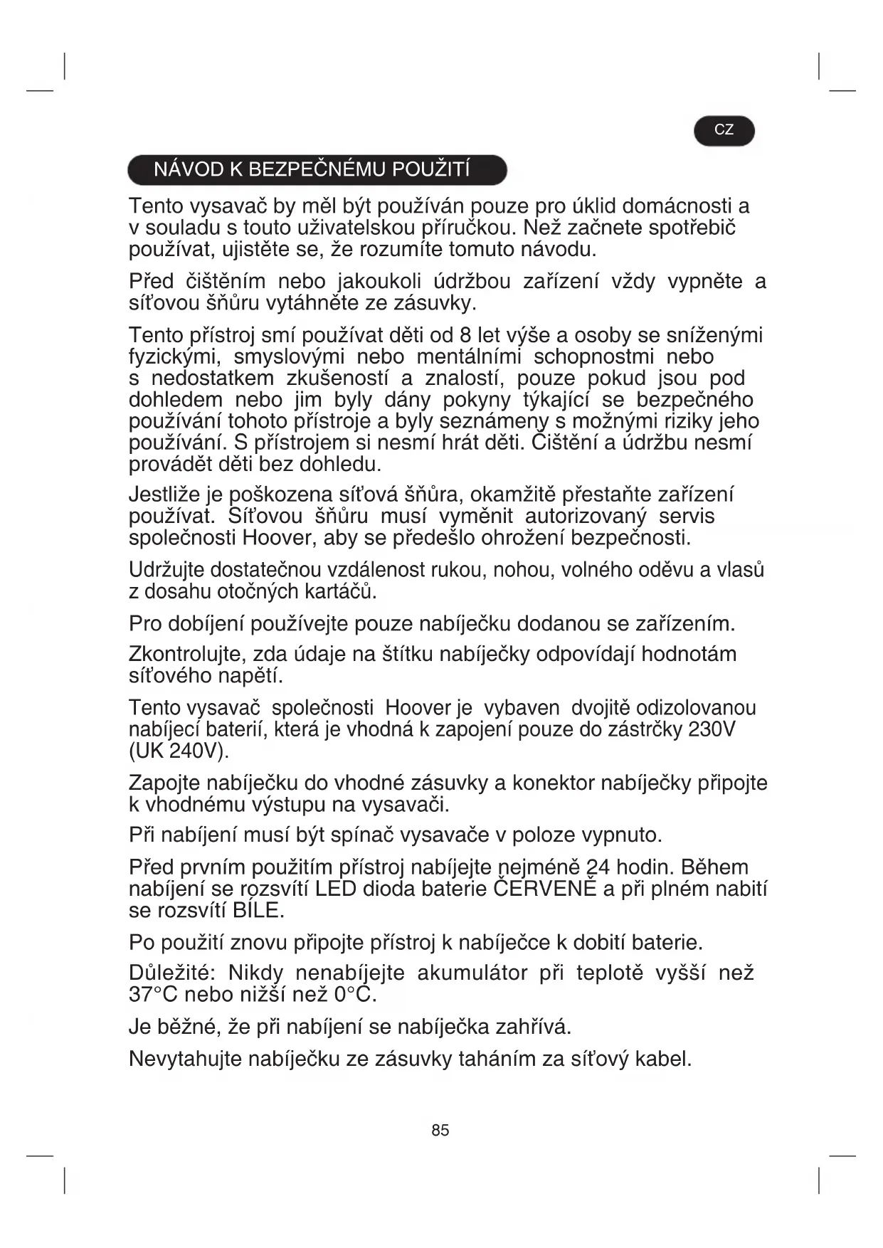 recyklingu. Nie należy ich wyrzucać ze śmieciami domowymi.85 NÁVOD K BEZPEČNÉMU POUŽITÍ Tento vysavač by měl být používán pouze pro úklid domácnosti a v souladu s touto uživatelskou příručkou. Než začnete spotřebič používat, ujistěte se, že rozumíte tomuto návodu. Před čištěním nebo jakoukoli údržbou zařízení vždy vypněte a síťovou šňůru vytáhněte ze zásuvky. Tento přístroj smí používat děti od 8 let výše a osoby se sníženými fyzickými, smyslovými nebo mentálními schopnostmi nebo s nedostatkem zkušeností a znalostí, pouze pokud jsou pod dohledem nebo jim byly dány pokyny týkající se bezpečného používání tohoto přístroje a byly seznámeny s možnými riziky jeho používání. S přístrojem si nesmí hrát děti. Čištění a údržbu nesmí provádět děti bez dohledu. Jestliže je poškozena síťová šňůra, okamžitě přestaňte zařízení používat. Síťovou šňůru musí vyměnit autorizovaný servis společnosti Hoover, aby se předešlo ohrožení bezpečnosti. Udržujte dostatečnou vzdálenost rukou, nohou, volného oděvu a vlasů z dosahu otočných kartáčů. Pro dobíjení používejte pouze nabíječku dodanou se zařízením. Zkontrolujte, zda údaje na štítku nabíječky odpovídají hodnotám síťového napětí. Tento vysavač společnosti Hoover je vybaven dvojitě odizolovanou nabíjecí baterií, která je vhodná k zapojení pouze do zástrčky 230V (UK 240V). Zapojte nabíječku do vhodné zásuvky a konektor nabíječky připojte k vhodnému výstupu na vysavači. Při nabíjení musí být spínač vysavače v poloze vypnuto. Před prvním použitím přístroj nabíjejte nejméně 24 hodin. Během nabíjení se rozsvítí LED dioda baterie ČERVENĚ a při plném nabití se rozsvítí BÍLE. Po použití znovu připojte přístroj k nabíječce k dobití baterie. Důležité: Nikdy nenabíjejte akumulátor při teplotě vyšší než 37°C nebo nižší než 0°C. Je běžné, že při nabíjení se nabíječka zahřívá. Nevytahujte nabíječku ze zásuvky taháním za síťový kabel. CZ86 V případě delší nepřítomnosti (dovolená apod.)nabíječku odpojte. Přístroj před použitím znovu dobijte, protože baterie by se při delší době skladování mohly vybít samy. Před likvidací vysavače z něj nejprve vyjměte baterie. Před odstraněním baterie se ujistěte, že výrobek je odpojen od elektrické sítě. Zlikvidujte baterie bezpečně a ekologicky. Používejte zařízení dokud baterie nejsou naprosto vybité. Použité baterie by měly být přijaté do recyklační stanice a nesmějí být vyhazované dohromady s domovním odpadem. Pro vyjmutí baterií prosím kontaktujte Zákaznické servisní středisko Hoover, které najdete na internetových stránkách www.hoover.cz nebo postupujte podle následujících pokynů: DŮLEŽITÉ UPOZORNĚNÍ: Před vyjmutím je nutno baterii zcela vybít. Nechte vysavač zapnutý, dokud nebudou baterie zcela vybité. Odpojte nabíječku od spotřebiče. Stiskněte tlačítko pro uvolnění baterie a posunutím ho vyjměte. [3] Poznámka: Budete-li mít při demontáži jednotky jakékoli problémy nebo budete-li požadovat podrobnější informace o manipulaci, využití a recyklaci tohoto výrobku, kontaktujte prosím místní úřad nebo středisko sběrných surovin. Používejte výhradně příslušenství, spotřební materiály a náhradní díly doporučené nebo dodávané firmou Hoover. Statická elektřina: Při čištění některých koberců vzniká malé množství statické elektřiny. Výboje statické elektřiny neohrožují zdraví. Nepoužívejte Vaše zařízení venku, nebo na mokré povrchy a na mokrá vysávání. Nevysávejte tvrdé nebo ostré předměty, zápalky, žhavý popel, cigaretové nedopalky a podobné předměty. Nestříkejte nebo nevysávejte hořlavé kapaliny, čistící tekutiny, aerosoly nebo jejich výpary. Během použití zařízení nepřejíždějte přes síťovou šňůru a nevytahujte síťový kabel ze zásuvky taháním za šňůru. Nepoužívejte zařízení nebo nabíjení, pokud vám připadá vadné. Servis Hoover najdete na internetových stránkách www. hoover.cz Spolehlivý provoz a vysoká účinnost tohoto spotřebiče jsou zajištěny pouze v případě, že bude prováděn pravidelný servis a opravy, které musí zajišťovat autorizovaný servis společnosti Hoover. CZKOMPONENTY PRODUKTU