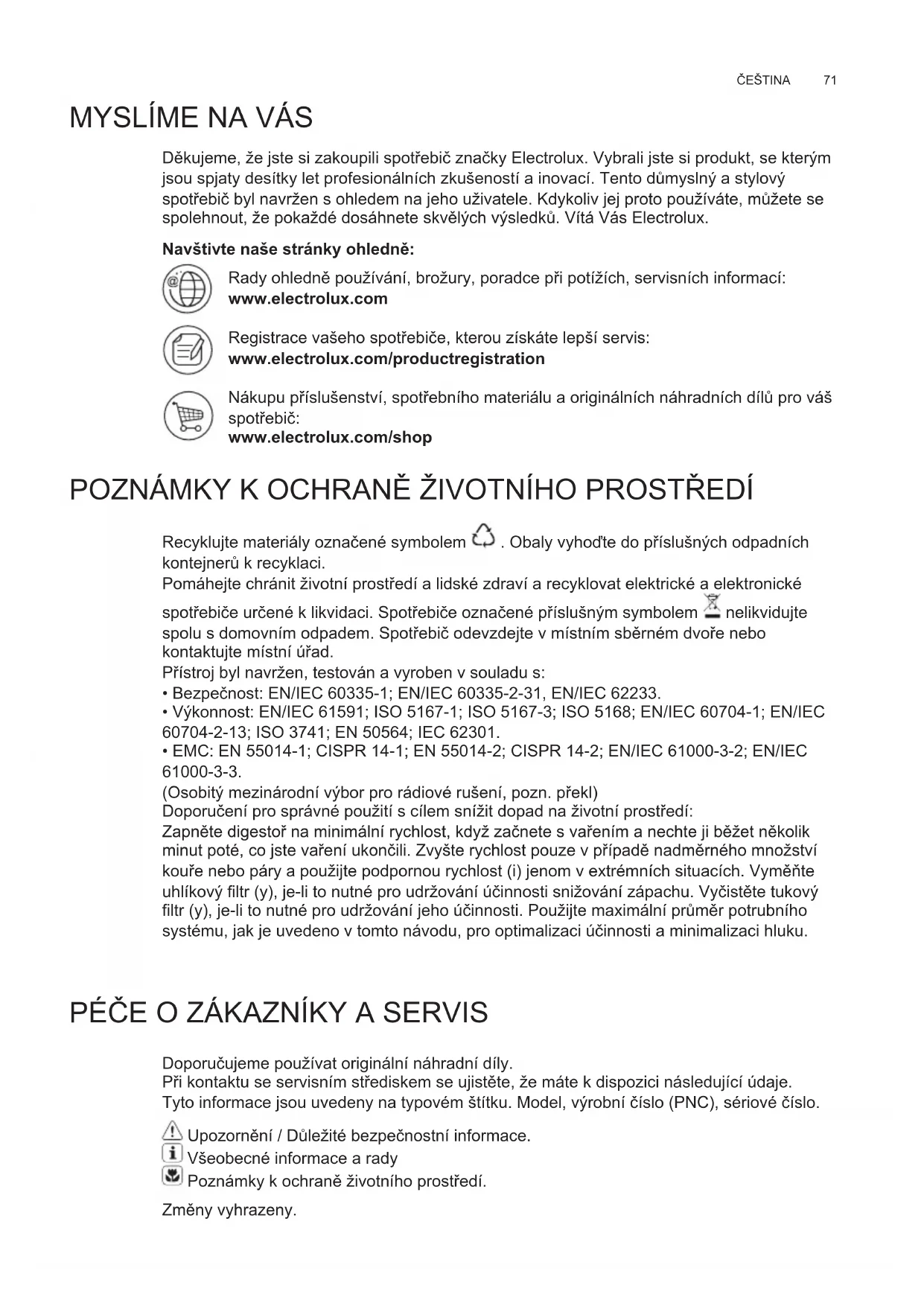 - EMC: EN 55014-1; CISPR 14-1; EN 55014-2; CISPR 14-2; EN/IEC 61000-3-2; EN/IEC 61000-3-3. (Osobitý mezinárodní výbor pro rádiové rušení, pozn. překl) Doporučení pro správné použití s cílem snížit dopad na životní prostředí: Zapněte digestoř na minimální rychlost, když začnete s vařením a nechte ji běžet několik minut poté, co jste vaření ukončili. Zvyšte rychlost pouze v případě nadměrného množství kouře nebo páry a použijte podpornou rychlost (i) jenom v extrémních situacích. Vyměňte uhlíkový filtr (y), je-li to nutné pro udržování účinnosti snižování zápachu. Vyčistěte tukový filtr (y), je-li to nutné pro udržování jeho účinnosti. Použijte maximální průměr potrubního systému, jak je uvedeno v tomto návodu, pro optimalizaci účinnosti a minimalizaci hluku. PÉČE O ZÁKAZNÍKY A SERVIS Doporučujeme používat originální náhradní díly. Při kontaktu se servisním střediskem se ujistěte, že máte k dispozici následující údaje. Tyto informace jsou uvedeny na typovém štítku. Model, výrobní číslo (PNC), sériové číslo. Upozornění / Důležité bezpečnostní informace. Všeobecné informace a rady Poznámky k ochraně životního prostředí. Změny vyhrazeny. CS NÁVOD K POUŽITÍwww.electrolux.com