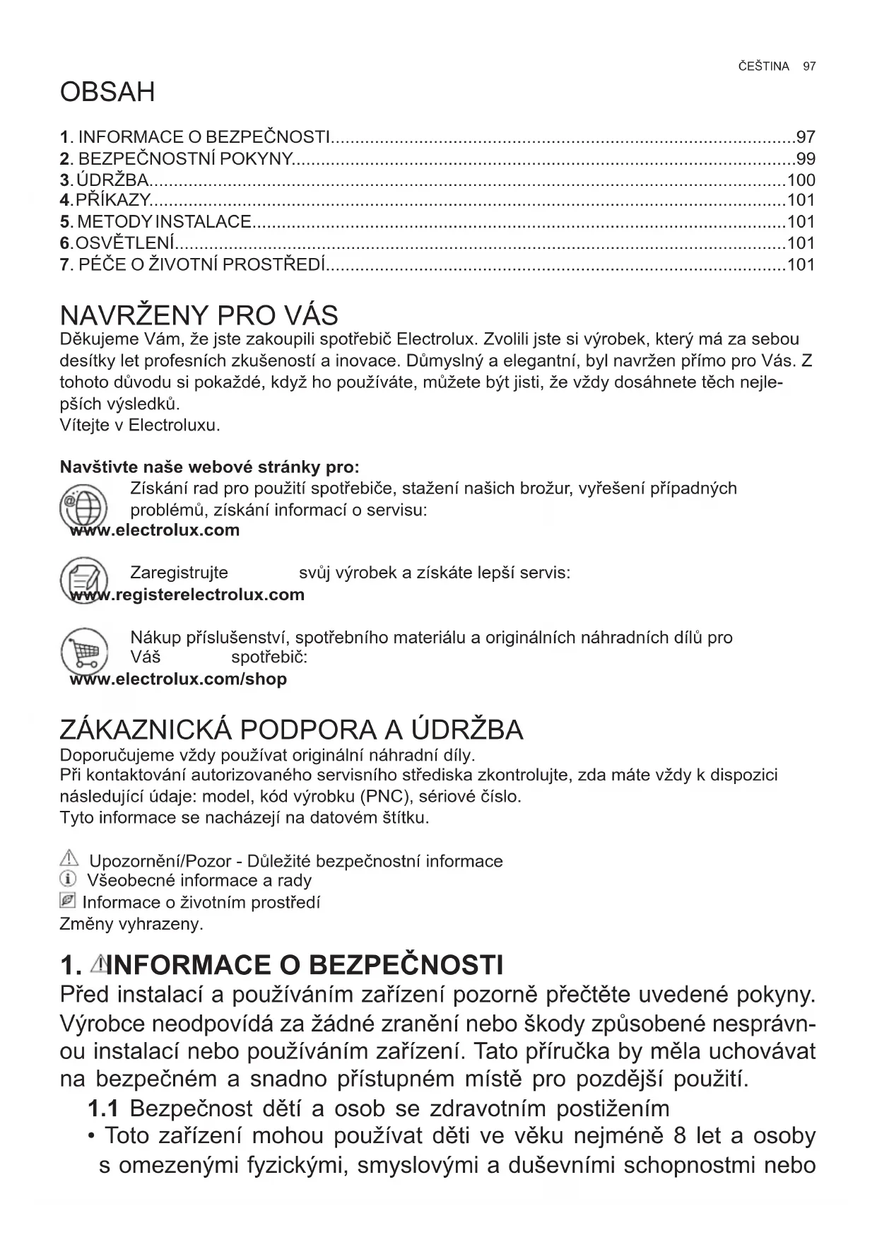 Děkujeme Vám, že jste zakoupili spotřebič Electrolux. Zvolili jste si výrobek, který má za sebou desítky let profesních zkušeností a inovace. Důmyslný a elegantní, byl navržen přímo pro Vás. Z tohoto důvodu si pokaždé, když ho používáte, můžete být jisti, že vždy dosáhnete těch nejle- pších výsledků. Vítejte v Electroluxu. Navštivte naše webové stránky pro: Získání rad pro použití spotřebiče, stažení našich brožur, vyřešení případných problémů, získání informací o servisu: www.electrolux.com Zaregistrujte svůj výrobek a získáte lepší servis: www.registerelectrolux.com Nákup příslušenství, spotřebního materiálu a originálních náhradních dílů pro Váš spotřebič: www.electrolux.com/shop