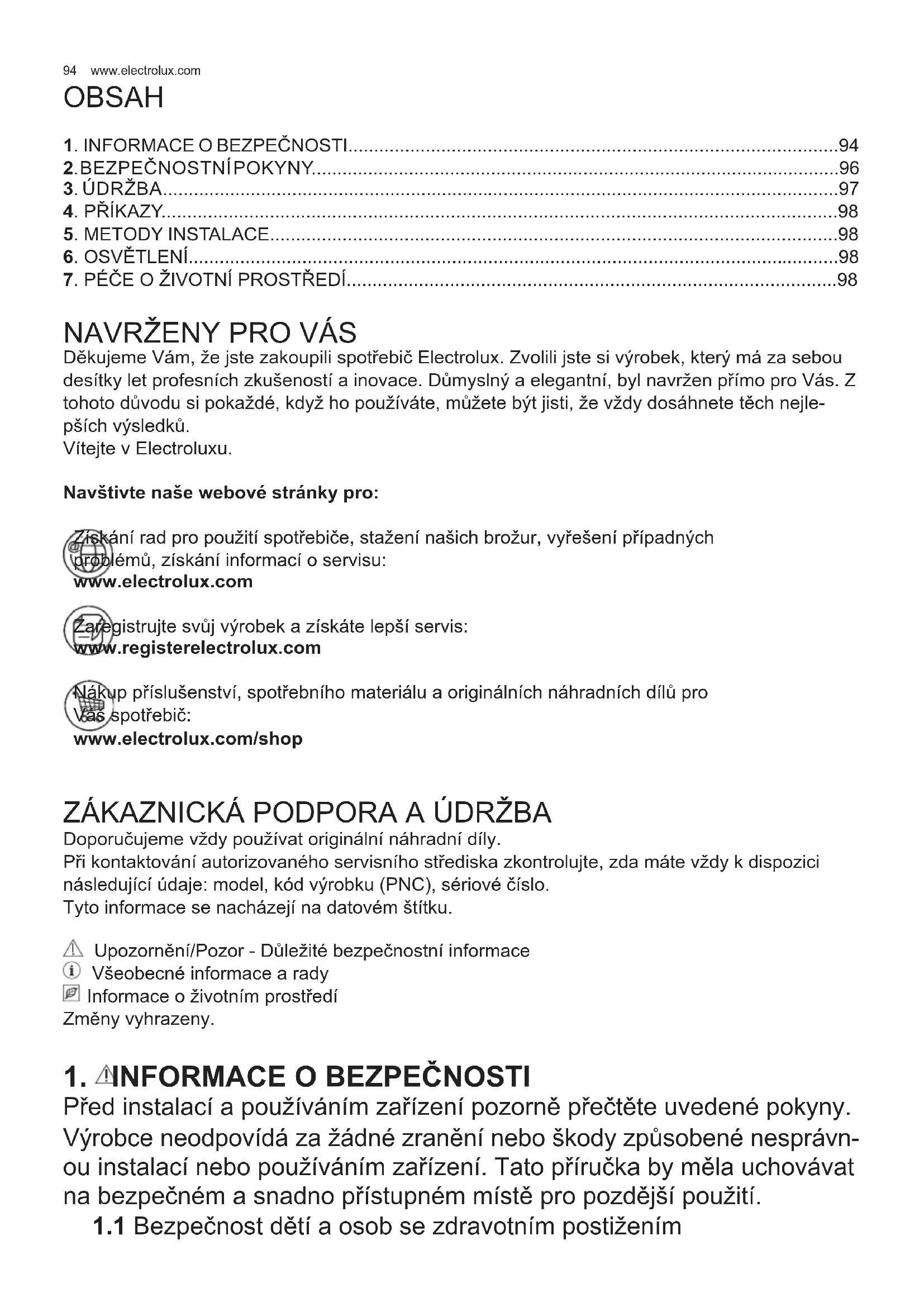 Děkujeme Vám, že jste zakoupili spotřebič Electrolux. Zvolili jste si výrobek, který má za sebou desítky let profesních zkušeností a inovace. Důmyslný a elegantní, byl navržen přímo pro Vás. Z tohoto důvodu si pokaždé, když ho používáte, můžete být jisti, že vždy dosáhnete těch nejle- pších výsledků. Vítejte v Electroluxu. Navštivte naše webové stránky pro: Získání rad pro použití spotřebiče, stažení našich brožur, vyřešení případných problémů, získání informací o servisu: www.electrolux.com Zaregistrujte svůj výrobek a získáte lepší servis: www.registerelectrolux.com Nákup příslušenství, spotřebního materiálu a originálních náhradních dílů pro Váš spotřebič: www.electrolux.com/shop
