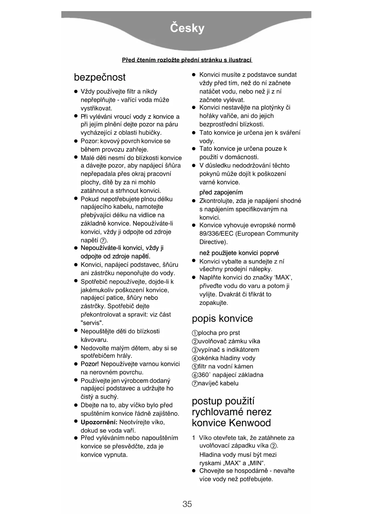 Naplñte konvici do znaïky ‘MAX’, p¡iveõte vodu do varu a potom ji vylijte. Dvakrát ïi t¡ikrát to zopakujte. popis konvice plocha pro prst uvolñovaï zámku víka vypínaï s indikátorem okénka hladiny vody filtr na vodní kámen 360˚ napájecí základna navíjeï kabelu postup použití rychlovamé nerez konvice Kenwood 1 Víko otevřete tak, že zatáhnete za uvolňovací západku víka . Hladina vody musí být mezi ryskami „MAX“ a „MIN“.