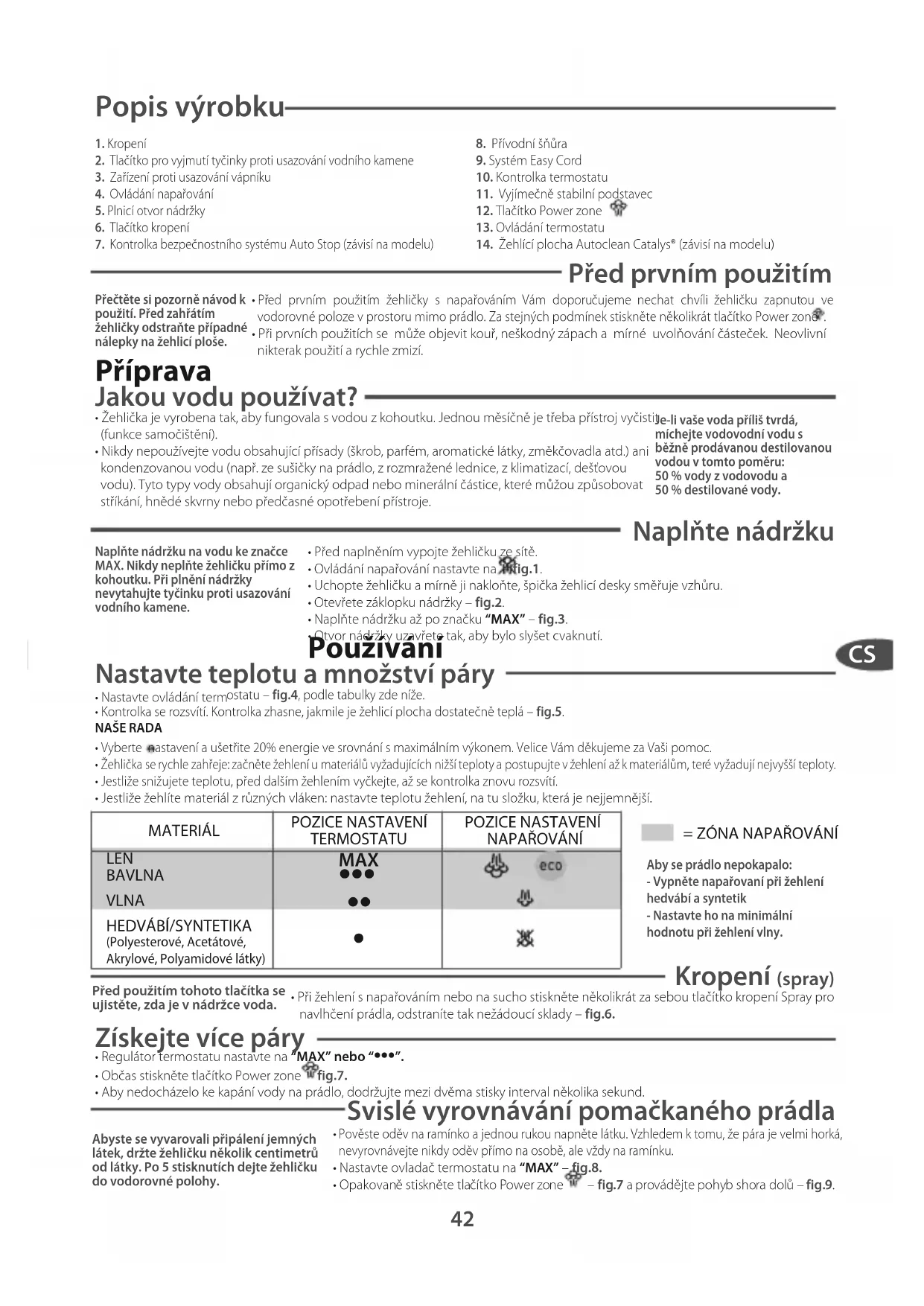 - Nastavte teplotu podle materiálu, který budete žehlit.• Nastavte ovladač napařování na – fig.1.• Jakmile kontrolka zhasne, můžete začít žehlit. Funkce Plus Žehlící plocha Autoclean Catalys® (závisí na modelu)