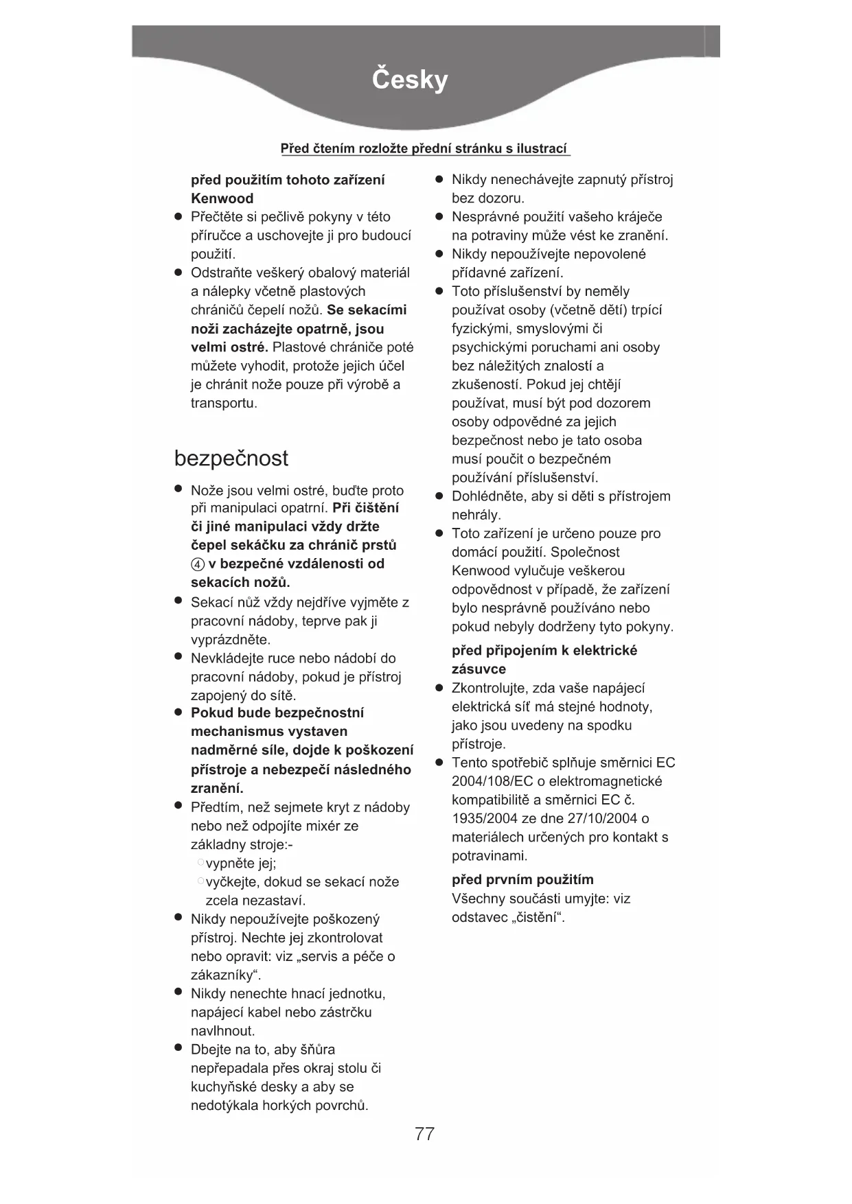 Tento spotřebič splňuje směrnici EC 2004/108/EC o elektromagnetické kompatibilitě a směrnici EC č. 1935/2004 ze dne 27/10/2004 o materiálech určených pro kontakt s potravinami. před prvním použitím Všechny součásti umyjte: viz odstavec „čistění“. Ïesky