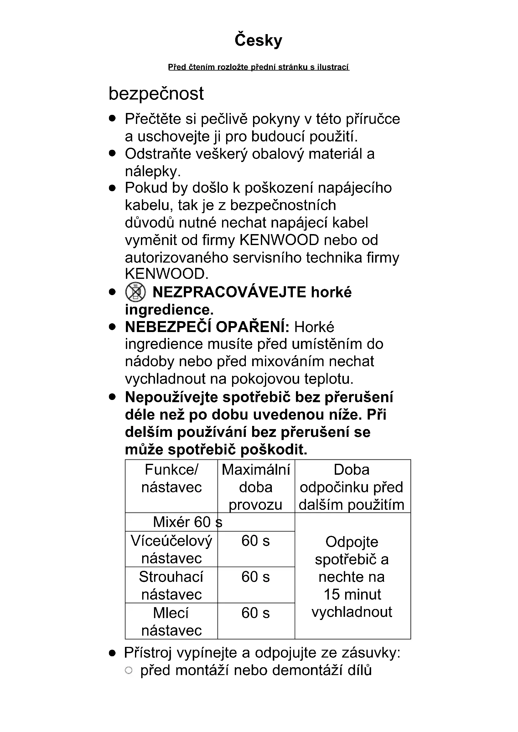 Nepoužívejte spotřebič bez přerušení déle než po dobu uvedenou níže. Při delším používání bez přerušení se může spotřebič poškodit. Funkce/ nástavec Maximální doba provozu Doba odpočinku před dalším použitím Mixér 60 s Odpojte spotřebič a nechte na 15 minut vychladnout Víceúčelový nástavec 60 s Strouhací nástavec 60 s Mlecí nástavec 60 s