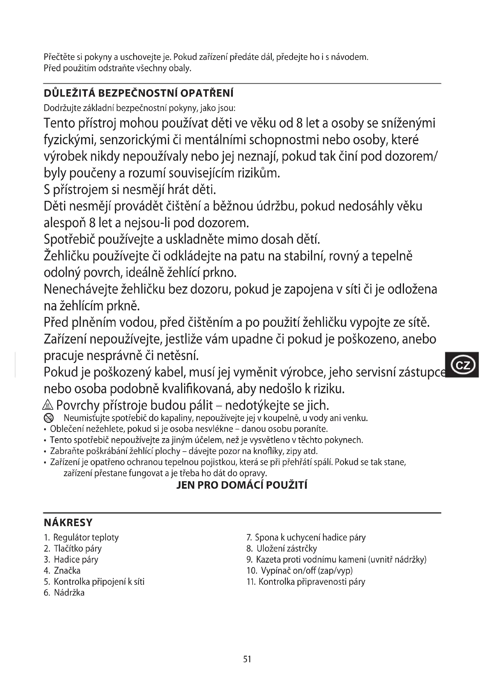 Во избежание воздействия вредных веществ на окружающую среду и здоровье приборы и батареи одноразового или многоразового использования, помеченные одним из этих символов, необходимо утилизировать отдельно от несортированных бытовых отходов. Обязательно утилизируйте электрические и электронные изделия, а также (если это применимо) батареи одноразового или многоразового использования в соответствующих официальных пунктах повторной переработки/сбора отходов.51 Přečtěte si pokyny a uschovejte je. Pokud zařízení předáte dál, předejte ho i s návodem. Před použitím odstraňte všechny obaly. DŮLEŽITÁ BEZPEČNOSTNÍ OPATŘENÍ Dodržujte základní bezpečnostní pokyny, jako jsou: Tento přístroj mohou používat děti ve věku od 8 let a osoby se sníženými fyzickými, senzorickými či mentálními schopnostmi nebo osoby, které výrobek nikdy nepoužívaly nebo jej neznají, pokud tak činí pod dozorem/ byly poučeny a rozumí souvisejícím rizikům. S přístrojem si nesmějí hrát děti. Děti nesmějí provádět čištění a běžnou údržbu, pokud nedosáhly věku alespoň 8 let a nejsou-li pod dozorem. Spotřebič používejte a uskladněte mimo dosah dětí. Žehličku používejte či odkládejte na patu na stabilní, rovný a tepelně odolný povrch, ideálně žehlící prkno. Nenechávejte žehličku bez dozoru, pokud je zapojena v síti či je odložena na žehlícím prkně. Před plněním vodou, před čištěním a po použití žehličku vypojte ze sítě. Zařízení nepoužívejte, jestliže vám upadne či pokud je poškozeno, anebo pracuje nesprávně či netěsní. Pokud je poškozený kabel, musí jej vyměnit výrobce, jeho servisní zástupce nebo osoba podobně kvalikovaná, aby nedošlo k riziku. h Povrchy přístroje budou pálit – nedotýkejte se jich.