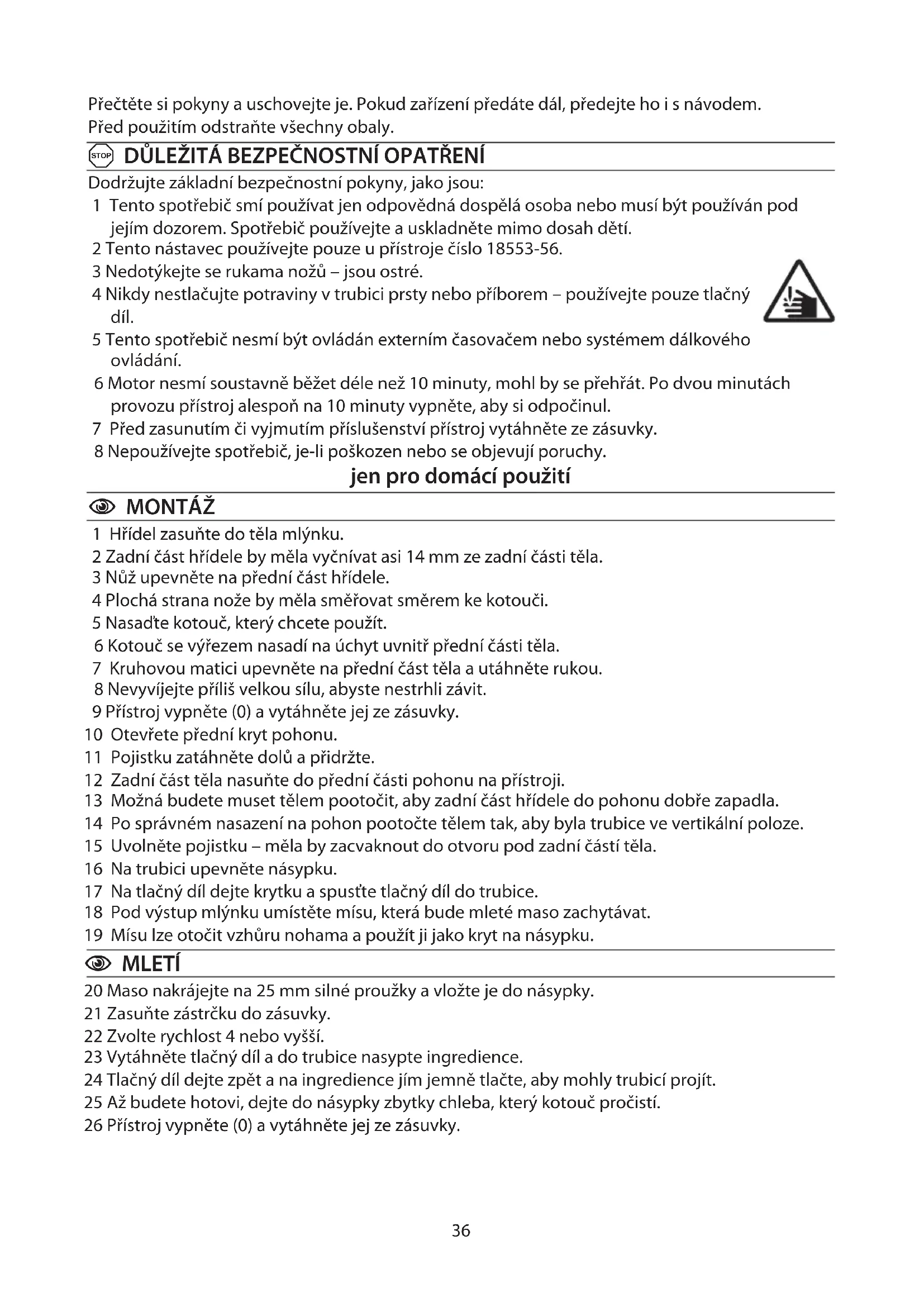 Пропустите смесь через насадку. Придайте ей форму печенья. Положите смесь на смазанный жиром противень. Выпекайте в предварительно разогретой духовке при 200°C в течение 6-10 минут.36 Přečtěte si pokyny a uschovejte je. Pokud zařízení předáte dál, předejte ho i s návodem. Před použitím odstraňte všechny obaly. A DŮLEŽITÁ BEZPEČNOSTNÍ OPATŘENÍ Dodržujte základní bezpečnostní pokyny, jako jsou: 1 Tento spotřebič smí používat jen odpovědná dospělá osoba nebo musí být používán pod jejím dozorem. Spotřebič používejte a uskladněte mimo dosah dětí. 2 Tento nástavec používejte pouze u přístroje číslo 18553-56. 3 Nedotýkejte se rukama nožů – jsou ostré. 4 Nikdy nestlačujte potraviny v trubici prsty nebo příborem – používejte pouze tlačný díl. 5 Tento spotřebič nesmí být ovládán externím časovačem nebo systémem dálkového ovládání. 6 Motor nesmí soustavně běžet déle než 10 minuty, mohl by se přehřát. Po dvou minutách provozu přístroj alespoň na 10 minuty vypněte, aby si odpočinul. 7 Před zasunutím či vyjmutím příslušenství přístroj vytáhněte ze zásuvky. 8 Nepoužívejte spotřebič, je-li poškozen nebo se objevují poruchy. jen pro domácí použití C MONTÁŽ 1 Hřídel zasuňte do těla mlýnku. 2 Zadní část hřídele by měla vyčnívat asi 14 mm ze zadní části těla. 3 Nůž upevněte na přední část hřídele. 4 Plochá strana nože by měla směřovat směrem ke kotouči. 5 Nasaďte kotouč, který chcete použít. 6 Kotouč se výřezem nasadí na úchyt uvnitř přední části těla. 7 Kruhovou matici upevněte na přední část těla a utáhněte rukou. 8 Nevyvíjejte příliš velkou sílu, abyste nestrhli závit. 9 Přístroj vypněte () a vytáhněte jej ze zásuvky. 10 Otevřete přední kryt pohonu. 11 Pojistku zatáhněte dolů a přidržte. 12 Zadní část těla nasuňte do přední části pohonu na přístroji. 13 Možná budete muset tělem pootočit, aby zadní část hřídele do pohonu dobře zapadla. 14 Po správném nasazení na pohon pootočte tělem tak, aby byla trubice ve vertikální poloze. 15 Uvolněte pojistku – měla by zacvaknout do otvoru pod zadní částí těla. 16 Na trubici upevněte násypku. 17 Na tlačný díl dejte krytku a spusťte tlačný díl do trubice. 18 Pod výstup mlýnku umístěte mísu, která bude mleté maso zachytávat. 19 Mísu lze otočit vzhůru nohama a použít ji jako kryt na násypku. C MLETÍ 20 Maso nakrájejte na 25 mm silné proužky a vložte je do násypky. 21 Zasuňte zástrčku do zásuvky. 22 Zvolte rychlost 4 nebo vyšší. 23 Vytáhněte tlačný díl a do trubice nasypte ingredience. 24 Tlačný díl dejte zpět a na ingredience jím jemně tlačte, aby mohly trubicí projít. 25 Až budete hotovi, dejte do násypky zbytky chleba, který kotouč pročistí. 26 Přístroj vypněte () a vytáhněte jej ze zásuvky.37 C JAKÝ KOTOUČ? 27 Jemný kotouč používejte k mletí syrového masa a při výrobě masových kuliček nebo k mletí citrusové kůry. 28 Pokud potřebujete, aby mlýnek mlel ještě jemněji, např. u párků či paštik, již pomleté maso pomelte ještě jednou. 29 Hrubý kotouč používejte k mletí syrového masa na hamburgery. 30 Pokud melete cokoliv jiného, použijte takový kotouč, který nejlépe vyhovuje vámi požadovanému rozměru.