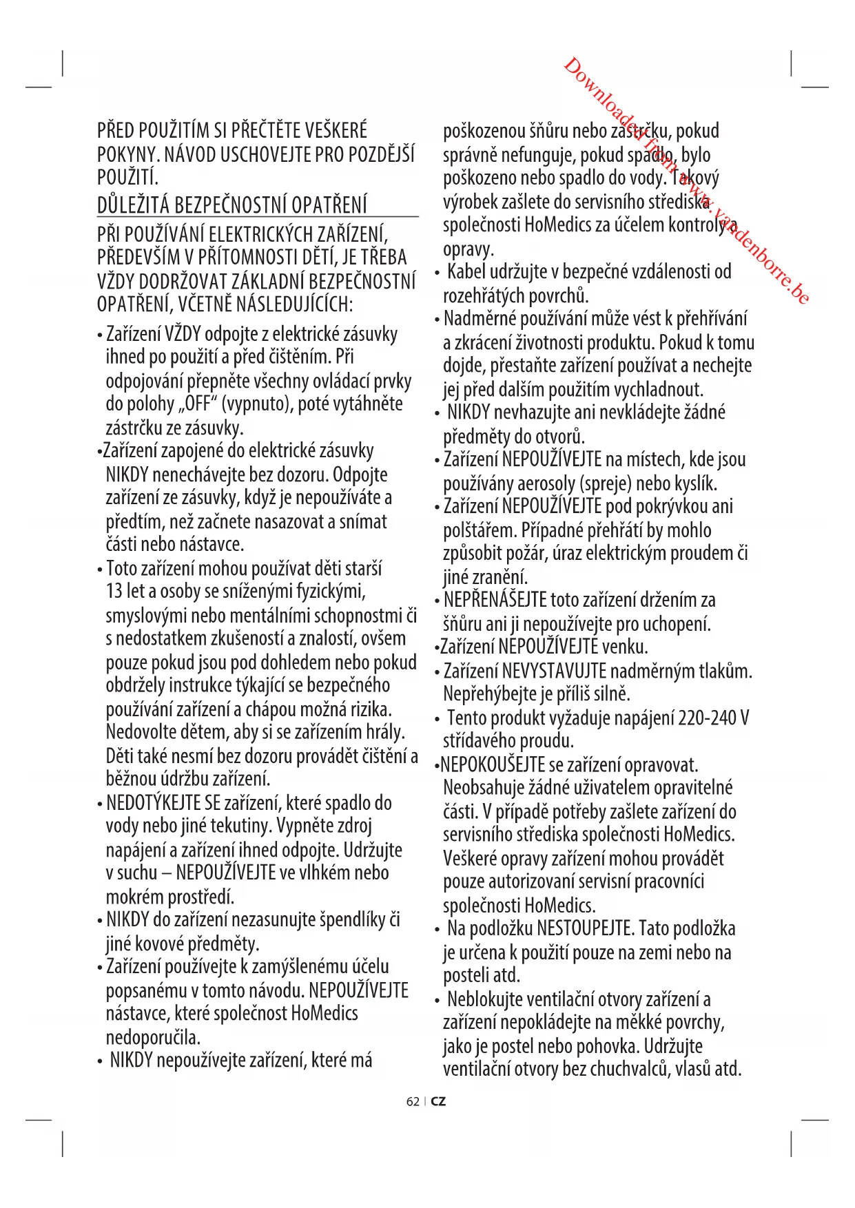 - Zařízení používejte k zamýšlenému účelu popsanému v tomto návodu. NEPOUŽÍVEJTE nástavce, které společnost HoMedics nedoporučila.