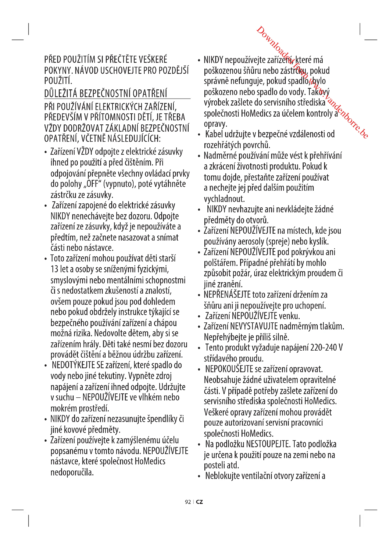 - Zařízení používejte k zamýšlenému účelu popsanému v tomto návodu. NEPOUŽÍVEJTE nástavce, které společnost HoMedics nedoporučila.