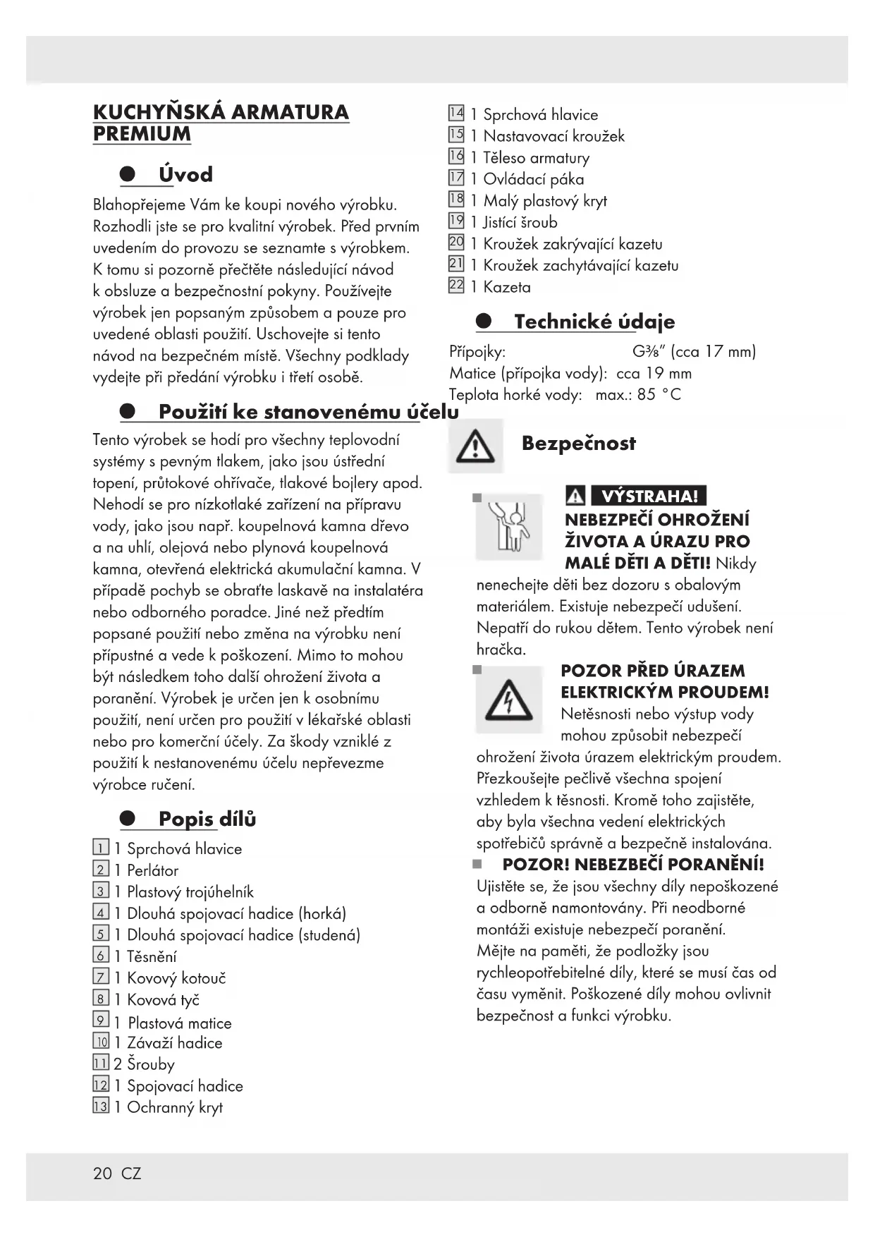v pravidelných intervalech vyšroubujte a odstraňte zbytky vápníku nebo cizí tělesa. Při nedodržování návodu k ošetřování se musí počítat s poškozením povrchu. Nároky na záruku nelze uplatňovat. Zlikvidování Obal se skládá z ekologických materiálů, které můžete zlikvidovat prostřednictvím místních sběren recyklovatelných materiálů. O možnostech likvidace vysloužilých zařízení se informujte u správy vaší obce nebo města. Informace Pitnost vodovodní vody O pitnosti vody se informujte u místních úřadů ve vašem městě / obce. Pro pitnost vodovodní vody platí zásadně následující doporučení: Nechejte vodu z potrubí krátkou dobu téci, stagnovala-li více než čtyři hodiny v potrubí. Stagnovanou vodu zejména nepoužívejte k přípravě jídel a nápojů při výživě kojenců. Jinak mohou vzniknout zdravotní potíže. Čerstvou vodu můžete rozpoznat tím, že citelně chladnější opustí potrubí, než stagnovaná voda. Stagnovanou bodu z pochromovaných potrubí nepoužívejte k potravě a / nebo k péči o tělo, jste-li alergičtí na nikl. Taková voda může obsahovat velké množství niklu a vyvolat alergické reakce. Pitnou vodu z olovnatých potrubí nepoužívejte k přípravě kojenecké výživy a / nebo během těhotenství k přípravě potravin. Olovo vnikne do pitné vody a zejména škodí zdraví kojenců a malých dětí. Záruka Výrobek byl vyroben s nejvyšší pečlivostí podle přísných kvalitativních směrnic a před odesláním prošel výstupní kontrolou. V případě závad máte možnost uplatnění zákonných práv vůči prodejci. Vaše práva ze zákona nejsou omezena naší níže uvedenou zárukou. Na tento artikl platí 5záruka od data zakoupení. Záruční lhůta začíná od data zakoupení. Uschovejte si dobře originál pokladní stvrzenky. Tuto stvrzenku budete potřebovat jako doklad o zakoupení. Pokud se do 5let od data zakoupení tohoto výrobku vyskytne vada materiálu nebo výrobní vada, výrobek Vám –dle našeho rozhodnutí– bezplatně opravíme nebo vyměníme. Tato záruka zaniká, jestliže se výrobek poškodí, neodborně použil nebo neobdržel pravidelnou údržbu. Záruka platí na vady materiálu a výrobní vady. Tato záruka se nevztahuje na díly výrobku podléhající opotřebení (např. na baterie), dále na poškození křehkých, choulostivých dílů, např. vypínačů, akumulátorů nebo dílů zhotovených ze skla.23 ES