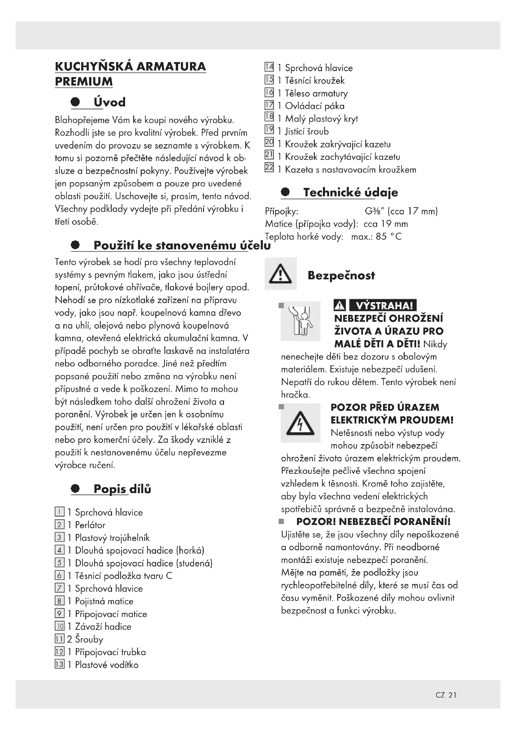PREMIUM Úvod Blahopřejeme Vám ke koupi nového výrobku. Rozhodli jste se pro kvalitní výrobek. Před prvním uvedením do provozu se seznamte s výrobkem. K tomu si pozorně přečtěte následující návod k ob- sluze a bezpečnostní pokyny. Používejte výrobek jen popsaným způsobem a pouze pro uvedené oblasti použití. Uschovejte si, prosím, tento návod. Všechny podklady vydejte při předání výrobku i třetí osobě. § Použití ke stanovenému účelu Tento výrobek se hodí pro všechny teplovodní systémy s pevným tlakem, jako jsou ústřední topení, průtokové ohřívače, tlakové bojlery apod. Nehodí se pro nízkotlaké zařízení na přípravu vody, jako jsou např. koupelnová kamna dřevo a na uhlí, olejová nebo plynová koupelnová kamna, otevřená elektrická akumulační kamna. V případě pochyb se obraťte laskavě na instalatéra nebo odborného poradce. Jiné než předtím popsané použití nebo změna na výrobku není přípustné a vede k poškození. Mimo to mohou být následkem toho další ohrožení života a poranění. Výrobek je určen jen k osobnímu použití, není určen pro použití v lékařské oblasti nebo pro komerční účely. Za škody vzniklé z použití k nestanovenému účelu nepřevezme výrobce ručení. § Popis dílů
