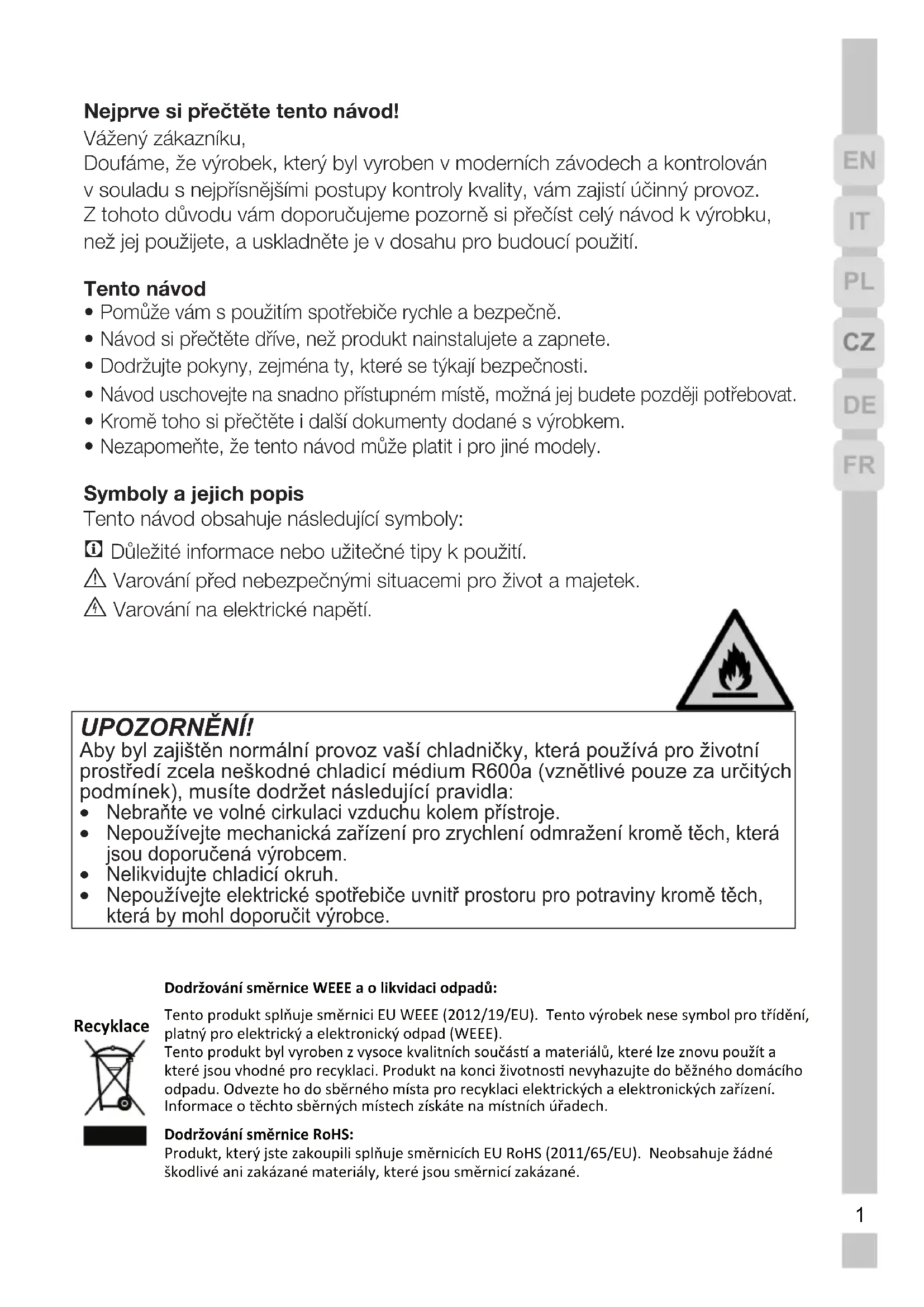 Nezapomeňte, že tento návod může platit i pro jiné modely. Symboly a jejich popis Tento návod obsahuje následující symboly: C Důležité informace nebo užitečné tipy k použití. A Varování před nebezpečnými situacemi pro život a majetek. B Varování na elektrické napětí. Dodržování směrnice WEEE a o likvidaci odpadů: Tento produkt splňuje směrnici EU WEEE (2012/19/EU). Tento výrobek nese symbol pro třídění, platný pro elektrický a elektronický odpad (WEEE). Tento produkt byl vyroben z vysoce kvalitních součás a materiálů, které lze znovu použít a které jsou vhodné pro recyklaci. Produkt na konci životnos nevyhazujte do běžného domácího odpadu. Odvezte ho do sběrného místa pro recyklaci elektrických a elektronických zařízení. Informace o těchto sběrných místech získáte na místních úřadech. Dodržování směrnice RoHS: Produkt, který jste zakoupili splňuje směrnicích EU RoHS (2011/65/EU). Neobsahuje žádné škodlivé ani zakázané materiály, které jsou směrnicí zakázané. Recyklace UPOZORNĚNÍ! Aby byl zajištěn normální provoz vaší chladničky, která používá pro životní prostředí zcela neškodné chladicí médium R600a (vznětlivé pouze za určitých podmínek), musíte dodržet následující pravidla: