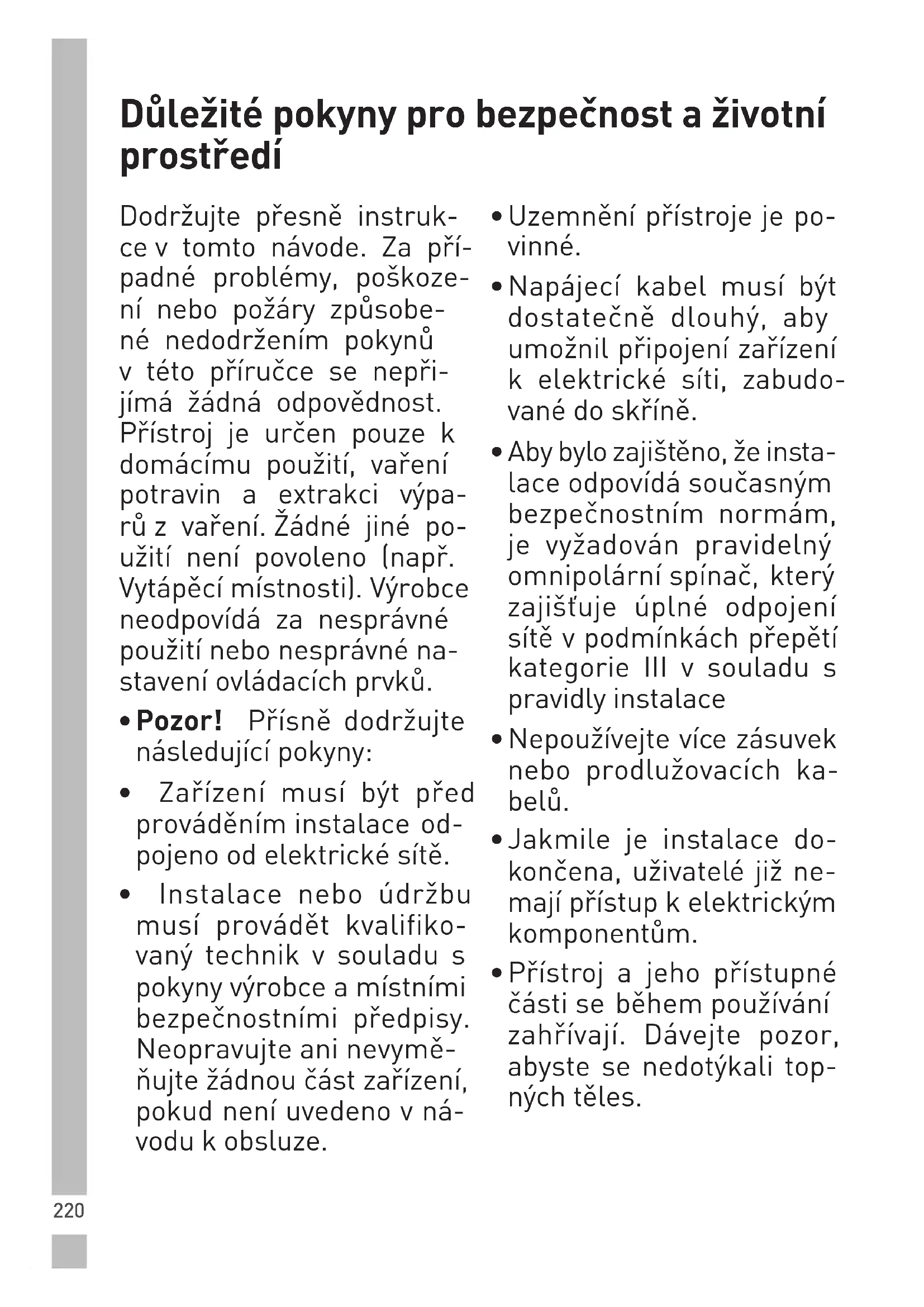 FR220 Důležité pokyny pro bezpečnost a životní prostředí Dodržujte přesně instruk- ce v tomto návode. Za pří- padné problémy, poškoze- ní nebo požáry způsobe- né nedodržením pokynů v této příručce se nepři- jímá žádná odpovědnost. Přístroj je určen pouze k domácímu použití, vaření potravin a extrakci výpa- rů z vaření. Žádné jiné po- užití není povoleno (např. Vytápěcí místnosti). Výrobce neodpovídá za nesprávné použití nebo nesprávné na- stavení ovládacích prvků.