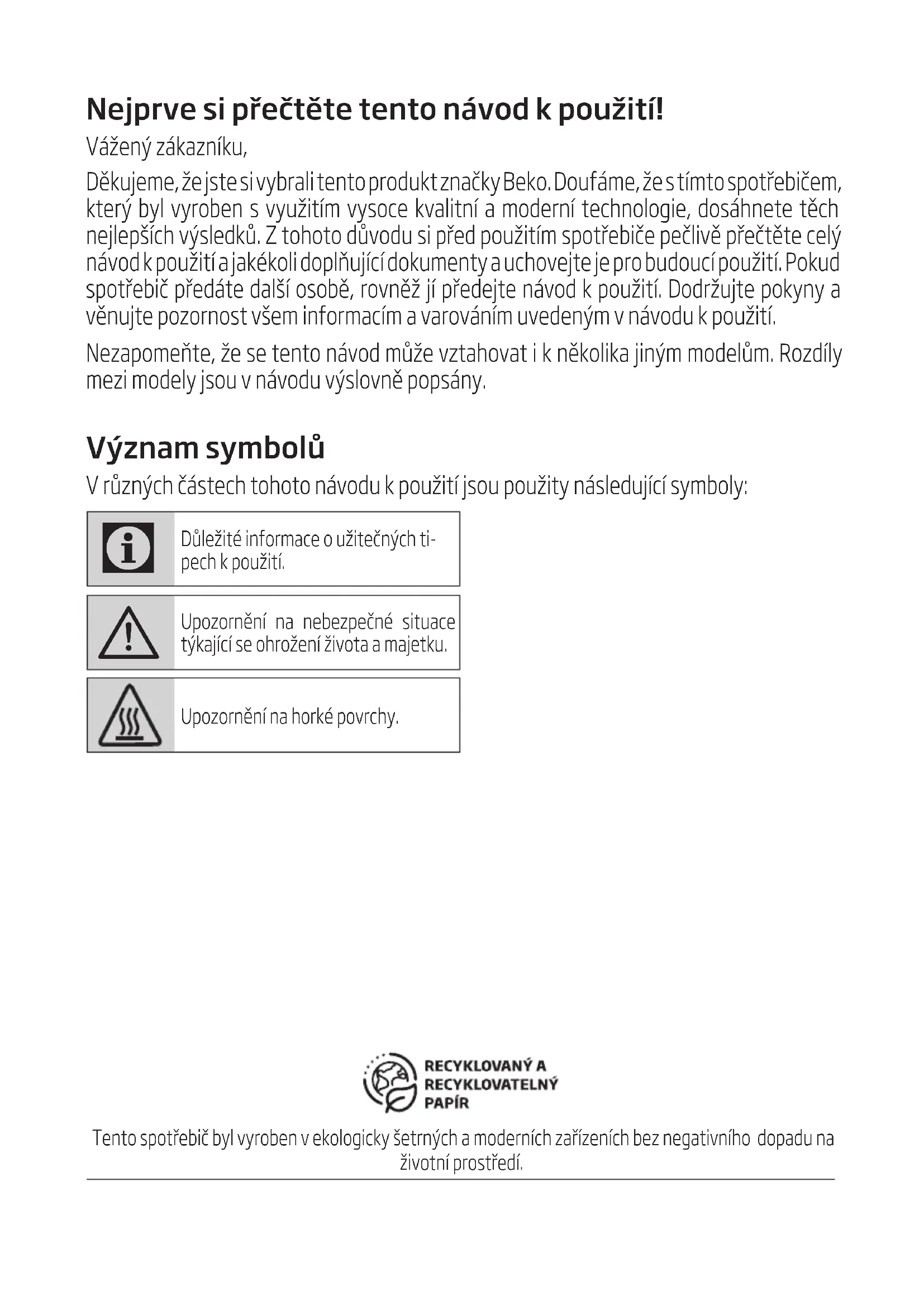 Niniejsze warunki gwarancji mają zastosowanie do Urządzeń zakupionych od dnia 01.03.2019 r. Gwarant oświadcza, że niniejsza Gwarancja jest udzielana Użytkownikowi dodatkowo i nie wyłącza, nie ogranicza ani nie zawiesza uprawnień Użytkownika wynikających z przepisów o rękojmi za wady rzeczy sprzedanej na podstawie Kodeksu cywilnego.Nejprve si přečtěte tento návod k použití! Vážený zákazníku, Děkujeme, že jste si vybrali tento produkt značky Beko. Doufáme, že s tímto spotřebičem, který byl vyroben s využitím vysoce kvalitní a moderní technologie, dosáhnete těch nejlepších výsledků. Z tohoto důvodu si před použitím spotřebiče pečlivě přečtěte celý návod k použití a jakékoli doplňující dokumenty a uchovejte je pro budoucí použití. Pokud spotřebič předáte další osobě, rovněž jí předejte návod k použití. Dodržujte pokyny a věnujte pozornost všem informacím a varováním uvedeným v návodu k použití. Nezapomeňte, že se tento návod může vztahovat i k několika jiným modelům. Rozdíly mezi modely jsou v návodu výslovně popsány. Význam symbolů V různých částech tohoto návodu k použití jsou použity následující symboly: