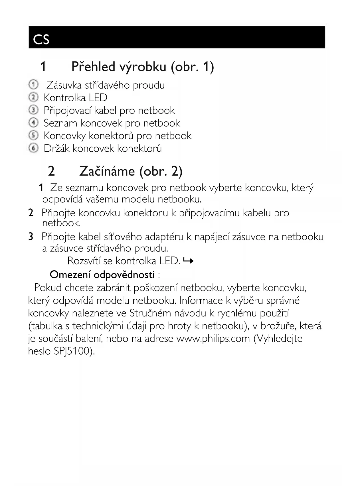 dCS 1 Přehled výrobku (obr. 1) Zásuvka střídavého proudu Kontrolka LED Připojovací kabel pro netbook Seznam koncovek pro netbook Koncovky konektorů pro netbook Držák koncovek konektorů 2 Začínáme (obr. 2) 1 Ze seznamu koncovek pro netbook vyberte koncovku, který odpovídá vašemu modelu netbooku. 2 Připojte koncovku konektoru k připojovacímu kabelu pro netbook. 3 Připojte kabel síťového adaptéru k napájecí zásuvce na netbooku a zásuvce střídavého proudu. Rozsvítí se kontrolka LED. » Omezení odpovědnosti : Pokud chcete zabránit poškození netbooku, vyberte koncovku, který odpovídá modelu netbooku. Informace k výběru správné koncovky naleznete ve Stručném návodu k rychlému použití (tabulka s technickými údaji pro hroty k netbooku), v brožuře, která je součástí balení, nebo na adrese www.philips.com (Vyhledejte heslo SPJ5100).3 Řešení problémů Problémy Příčiny Řešení Síťový adaptér pro přenosný netbook nepracuje správně (nebo kontrolka LED svítí, ale váš netbook není správně nabíjen). Vybraná koncovka nemusí odpovídat netbooku, ke kterému jste ji připojili. Zkontrolujte, zda jste připojili správnou koncovku podle seznamu koncovek pro netbook na držáků koncovek, brožury, která je součástí balení, nebo na adrese www. philips.com (Vyhledejte heslo SPJ5100), kde naleznete aktualizované informace pro výběr koncovek. Síťový adaptér pro přenosný netbook je horký nebo váš notebook není správně nabíjen (nebo kontrolka LED při napájení střídavým proudem bliká). Síťový adaptér pro přenosný netbook je propojen s notebookem s vyšší spotřebou. Síťový adaptér pro přenosný netbook bude po vychladnutí opět fungovat.Váš netbook nebo notebook se stále nabíjí. Nevím, zda napětí na koncovce odpovídá mému netbooku. N/A Napětí je vyraženo na koncovkách, např. 12 V, 19 V atd.4 Recyklace Výrobek je navržen a vyroben z vysoce kvalitního materiálu a součástí, které je možné recyklovat. Je-li výrobek označen tímto symbolem přeškrtnuté popelnice, znamená to, že se na něj vztahuje směrnice EU 2002/96/EC: Nevyhazujte toto zařízení do běžného domácího odpadu. Informujte se o místních předpisech týkajících se odděleného sběru elektrických a elektronických výrobků. Správnou likvidací starého výrobku pomůžete předejít možným negativním dopadům na životní prostředí a zdraví lidí.FCC - Notice of complianceFCC - Remarques sur la conformité© Royal Philips Electronics N.V. 2010 All rights reserved. Specifications are subject to change without notice.Trademarks are the property of Koninklijke Philips Electronics N.V. or their respective owners.