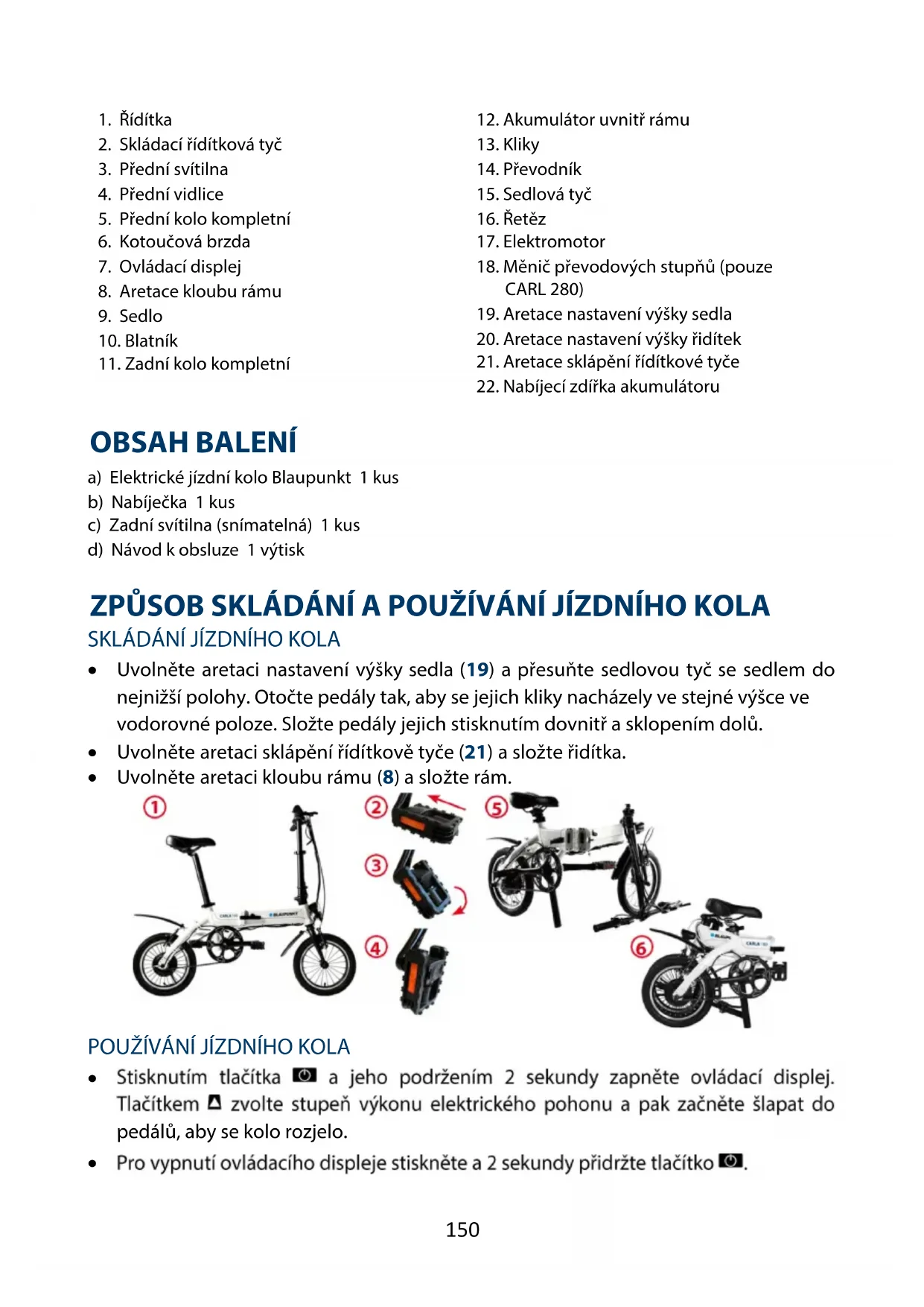 1. Řídítka 2. Skládací řídítková tyč 3. Přední svítilna 4. Přední vidlice 5. Přední kolo kompletní 6. Kotoučová brzda 7. Ovládací displej 8. Aretace kloubu rámu 9. Sedlo 10. Blatník 11. Zadní kolo kompletní 12. Akumulátor uvnitř rámu 13. Kliky 14. Převodník 15. Sedlová tyč 16. Řetěz 17. Elektromotor 18. Měnič převodových stupňů (pouze CARL 280) 19. Aretace nastavení výšky sedla 20. Aretace nastavení výšky řidítek 21. Aretace sklápění řídítkové tyče 22. Nabíjecí zdířka akumulátoru OBSAH BALENÍ a) Elektrické jízdní kolo Blaupunkt 1 kus b) Nabíječka 1 kus c) Zadní svítilna (snímatelná) 1 kus d) Návod k obsluze 1 výtisk ZPŮSOB SKLÁDÁNÍ A POUŽÍVÁNÍ JÍZDNÍHO KOLA SKLÁDÁNÍ JÍZDNÍHO KOLA Uvolněte aretaci nastavení výšky sedla (19) a přesuňte sedlovou tyč se sedlem do nejnižší polohy. Otočte pedály tak, aby se jejich kliky nacházely ve stejné výšce ve vodorovné poloze. Složte pedály jejich stisknutím dovnitř a sklopením dolů. Uvolněte aretaci sklápění řídítkově tyče (21) a složte řidítka. Uvolněte aretaci kloubu rámu (8) a složte rám. POUŽÍVÁNÍ JÍZDNÍHO KOLA Stisknutím tlačítka a jeho podržením 2 sekundy zapněte ovládací displej. Tlačítkem zvolte stupeň výkonu elektrického pohonu a pak začněte šlapat do pedálů, aby se kolo rozjelo. Pro vypnutí ovládacího displeje stiskněte a 2 sekundy přidržte tlačítko .