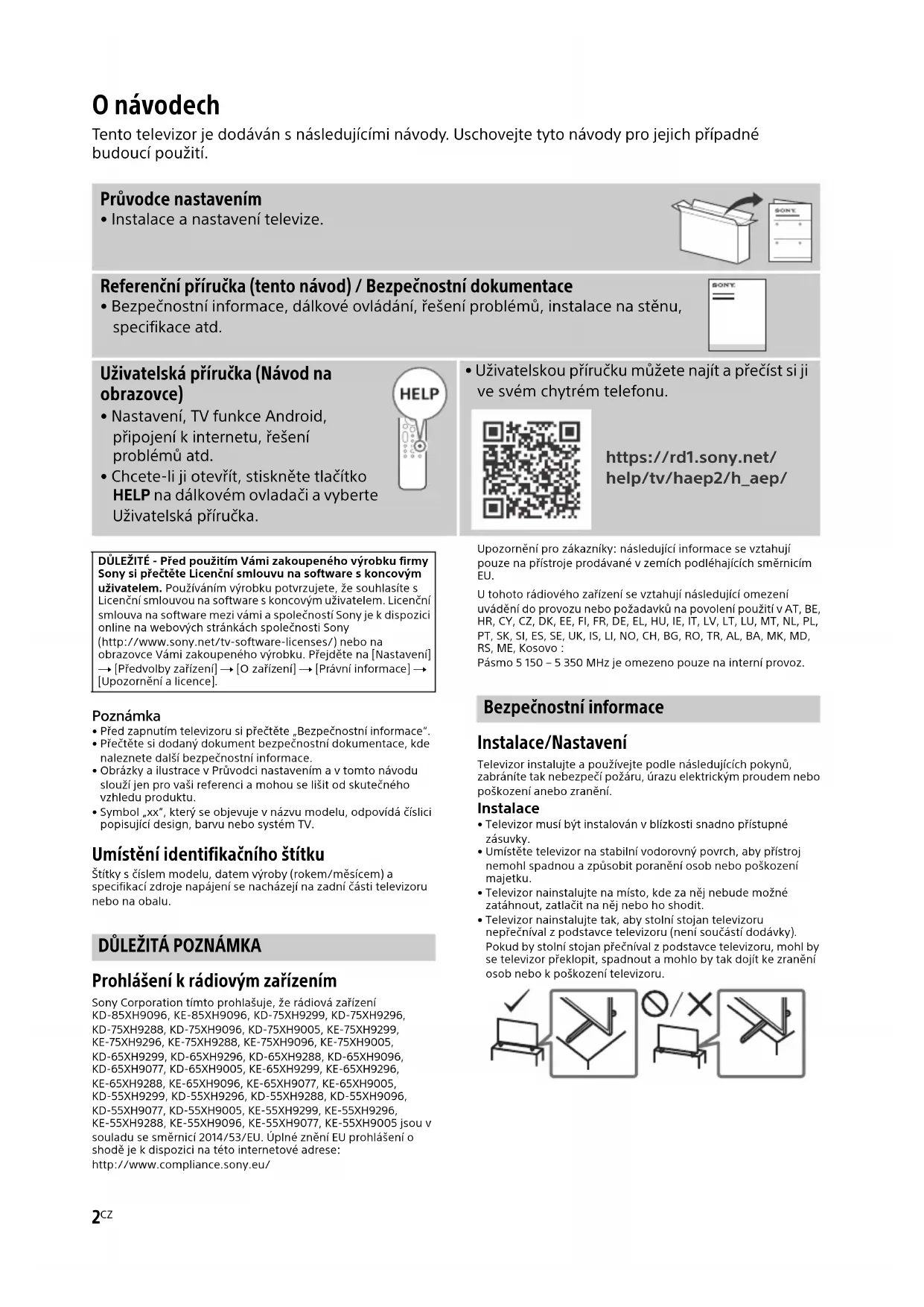 Prohlášení k rádiovým zařízením Sony Corporation tímto prohlašuje, že rádiová zařízení KD-85XH9096, KE-85XH9096, KD-75XH9299, KD-75XH9296, KD-75XH9288, KD-75XH9096, KD-75XH9005, KE-75XH9299, KE-75XH9296, KE-75XH9288, KE-75XH9096, KE-75XH9005, KD-65XH9299, KD-65XH9296, KD-65XH9288, KD-65XH9096, KD-65XH9077, KD-65XH9005, KE-65XH9299, KE-65XH9296, KE-65XH9288, KE-65XH9096, KE-65XH9077, KE-65XH9005, KD-55XH9299, KD-55XH9296, KD-55XH9288, KD-55XH9096, KD-55XH9077, KD-55XH9005, KE-55XH9299, KE-55XH9296, KE-55XH9288, KE-55XH9096, KE-55XH9077, KE-55XH9005 jsou v souladu se směrnicí 2014/53/EU. Úplné znění EU prohlášení o shodě je k dispozici na této internetové adrese: http://www.compliance.sony.eu/Upozornění pro zákazníky: následující informace se vztahují pouze na přístroje prodávané v zemích podléhajících směrnicím EU. U tohoto rádiového zařízení se vztahují následující omezení uvádění do provozu nebo požadavků na povolení použití v AT, BE, HR, CY, CZ, DK, EE, FI, FR, DE, EL, HU, IE, IT, LV, LT, LU, MT, NL, PL, PT, SK, SI, ES, SE, UK, IS, LI, NO, CH, BG, RO, TR, AL, BA, MK, MD, RS, ME, Kosovo :Pásmo 5 150 – 5 350 MHz je omezeno pouze na interní provoz. Bezpečnostní informace Instalace/Nastavení Televizor instalujte a používejte podle následujících pokynů, zabráníte tak nebezpečí požáru, úrazu elektrickým proudem nebo poškození anebo zranění. Instalace