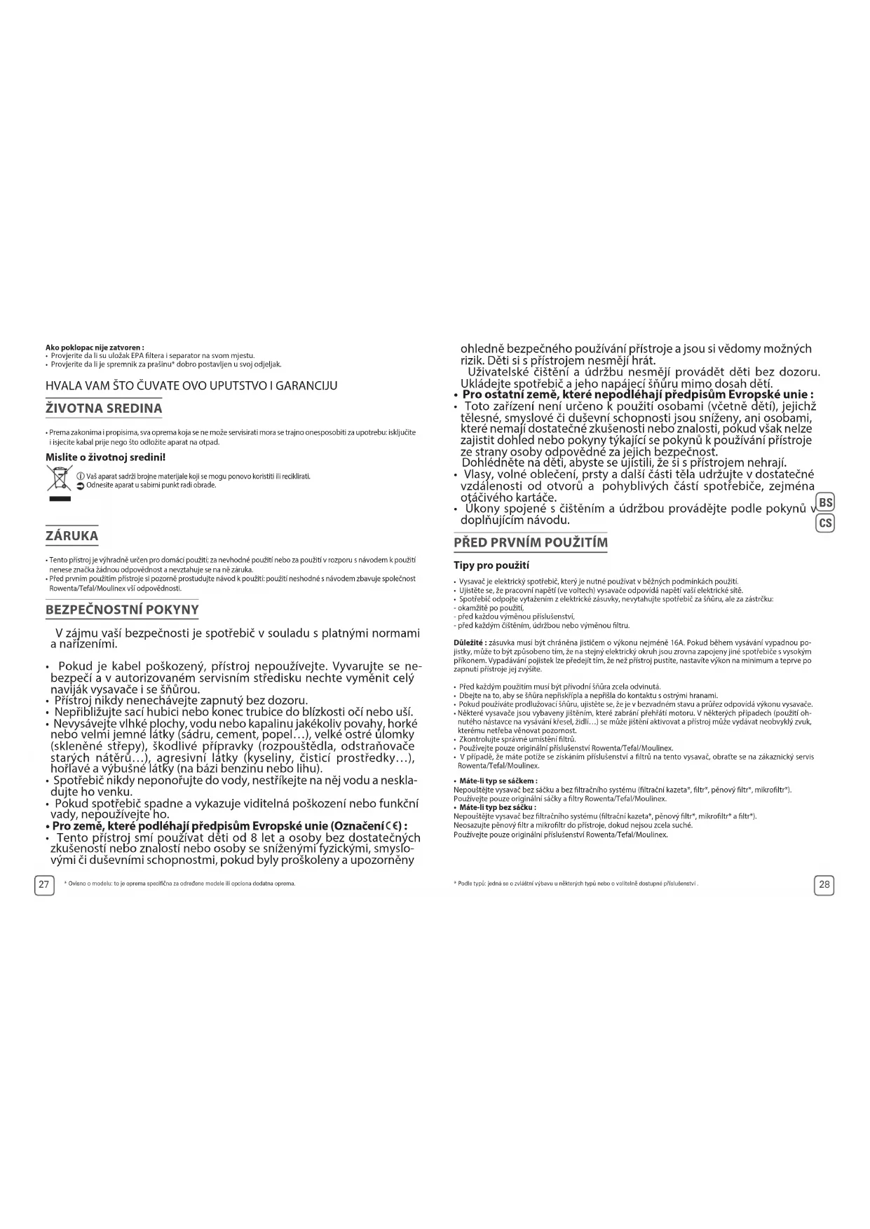 Tento přístroj je výhradně určen pro domácí použití; za nevhodné použití nebo za použití v rozporu s návodem k použití nenese značka žádnou odpovědnost a nevztahuje se na ně záruka. Před prvním použitím přístroje si pozorně prostudujte návod k použití: použití neshodné s návodem zbavuje společnost Rowenta/Tefal/Moulinex vší odpovědnosti.
