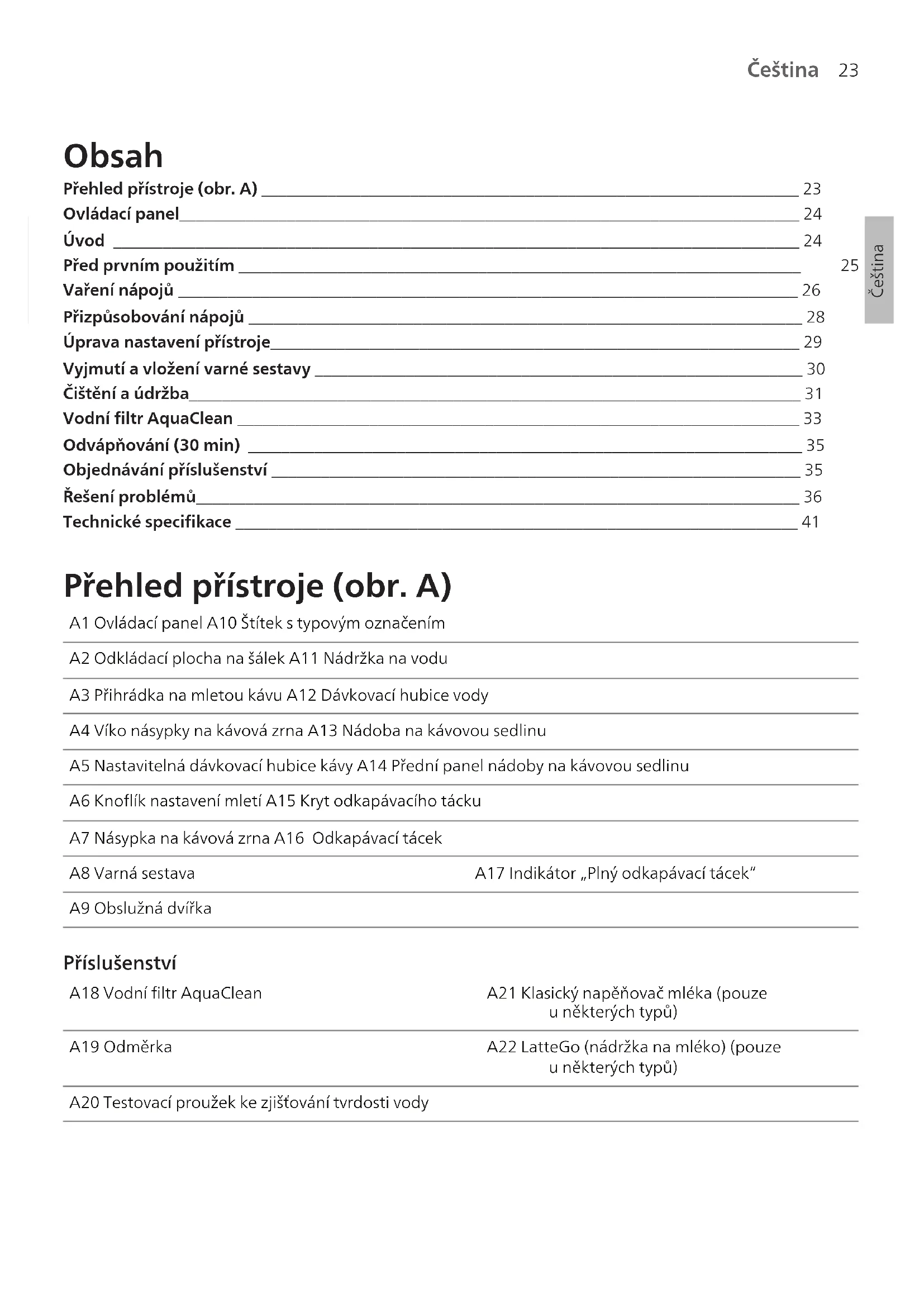 Čeština ČeštinaČeština Obsah Přehled přístroje (obr.A) _________________________________________________________________ 23Ovládací panel___________________________________________________________________________ 24Úvod ___________________________________________________________________________________ 24 Před prvním použitím ____________________________________________________________________ 25 Vaření nápojů ___________________________________________________________________________ 26Přizpůsobování nápojů ___________________________________________________________________ 28Úprava nastavení přístroje________________________________________________________________ 29Vyjmutí avložení varné sestavy ___________________________________________________________ 30Čištění aúdržba__________________________________________________________________________ 31Vodní filtr AquaClean ____________________________________________________________________ 33Odvápňování (30min) ___________________________________________________________________ 35Objednávání příslušenství ________________________________________________________________ 35Řešení problémů_________________________________________________________________________ 36Technické specifikace ____________________________________________________________________ 41 Přehled přístroje (obr.A) A1 Ovládací panel A10 Štítek stypovým označenímA2 Odkládací plocha na šálek A11 Nádržka na voduA3 Přihrádka na mletou kávu A12 Dávkovací hubice vodyA4 Víko násypky na kávová zrna A13 Nádoba na kávovou sedlinuA5 Nastavitelná dávkovací hubice kávy A14 Přední panel nádoby na kávovou sedlinuA6 Knoflík nastavení mletí A15 Kryt odkapávacího táckuA7 Násypka na kávová zrna A16 Odkapávací tácekA8 Varná sestava A17 Indikátor „Plný odkapávací tácek“A9 Obslužná dvířka Příslušenství A18 Vodní filtr AquaClean A21 Klasický napěňovač mléka (pouzeuněkterých typů)A19 Odměrka A22 LatteGo (nádržka na mléko) (pouzeuněkterých typů)A20 Testovací proužek ke zjišťování tvrdosti vody24 Čeština Ovládací panel Existují různé verze tohoto espresovače, které mohou mít vlastní specifický ovládací panel. Jednotlivé verze mají vlastní typové označení. Typové označení se nachází na štítku súdaji na vnitřní straně obslužných dvířek (obr. A9). Typové označení je možné zobrazit také stisknutím ikony Nastavení avýběrem možnosti „Podpora“. Přehled všech tlačítek aikon naleznete na obrázcíchC aD. Níže je uveden popis. Pomocí šipek nahoru adolů můžete procházet nabídkou na displeji aklepnutím na ikonu OK provedete výběr nebo potvrdíte volbu. Všechny typy (obr. C, D a E) C1, D1, E1 – Přímé ikony nápojů C3. Navigační ikony (nahoru, dolů, zpět, ok) C6. Nabídka čištění C2. Tlačítko spuštění/zastavení C4. Displej C7. Osobní profily D2, E2 – Nabídka sikonou Další nápoje C5. Nastavení přístroje C8. Vypínač Pouze typy EP4327, EP4324, EP4321 (obr. C) C1 – Přímé ikony nápojů: Tlačítka nápojů Espresso, Káva, Americano, CafféCrema, Ristretto, Horkávoda aSteam Pouze typy EP4349, EP4346, EP4343, EP4341 (obr. D) D1 – Přímé ikony nápojů: Tlačítka nápojů Espresso, Káva, Americano, Cappuccino, Latte Macchiato, Café au lait Pouze typy EP5447, EP5446, EP5444, EP5443, EP5441, EP5144 (obr. E) E1 – Přímé ikony nápojů: Tlačítka nápojů Espresso, Káva, Americano, Cappuccino, Latte Macchiato, Café au lait Úvod Gratulujeme Vám kzakoupení plně automatického kávovaru Philips! Chcete-li plně využívat podporu, kterou nabízíme, zaregistrujte si produkt na adrese www.home.id. Před prvním použitím kávovaru si pečlivě přečtěte samostatnou brožuru sbezpečnostními informacemi a uschovejte ji pro budoucí použití. Před prvním použitím opláchněte všechny odnímatelné doplňky určené pro styk svodou nebo mlékem horkou vodou. Nabízíme několik způsobů podpory, které vám pomohou uvést přístroj do provozu avyužívat ho na maximum. Vbalení se nachází: 1 Stručný návod kpoužití sobrázkovými pokyny kpoužívání ainformacemi očištění aúdržbě. 2 Samostatná bezpečnostní brožura spokyny kbezpečnému používání přístroje. 3 Vpřípadě zájmu oonline podporu (rozšířenou verzi této uživatelské příručky, časté dotazy, videa atd.) nasnímejte kód QR na obálce této brožury astáhněte si aplikaci HomeID, nebo navštivte stránky www.home.id/support. Kód QR je možné zobrazit také po stisknutí ikony Nastavení avýběru možnosti Podpora.25 Čeština Čeština Tento přístroj podstoupil zkoušku spoužitím kávy. Ikdyž byl pečlivě vyčištěn, mohly vněm zůstat zbytky kávy. Zaručujeme však, že přístroj je zcela nový. Přístroj automaticky upravuje množství mleté kávy, které je potřeba kpřípravě té nejchutnější kávy. Nejprve je třeba připravit 5káv, na nichž přístroj provede svou kalibraci. Před prvním použitím nezapomeňte propláchnout jednotku LatteGo (nádržka na mléko) nebo klasický napěňovač mléka. Před prvním použitím