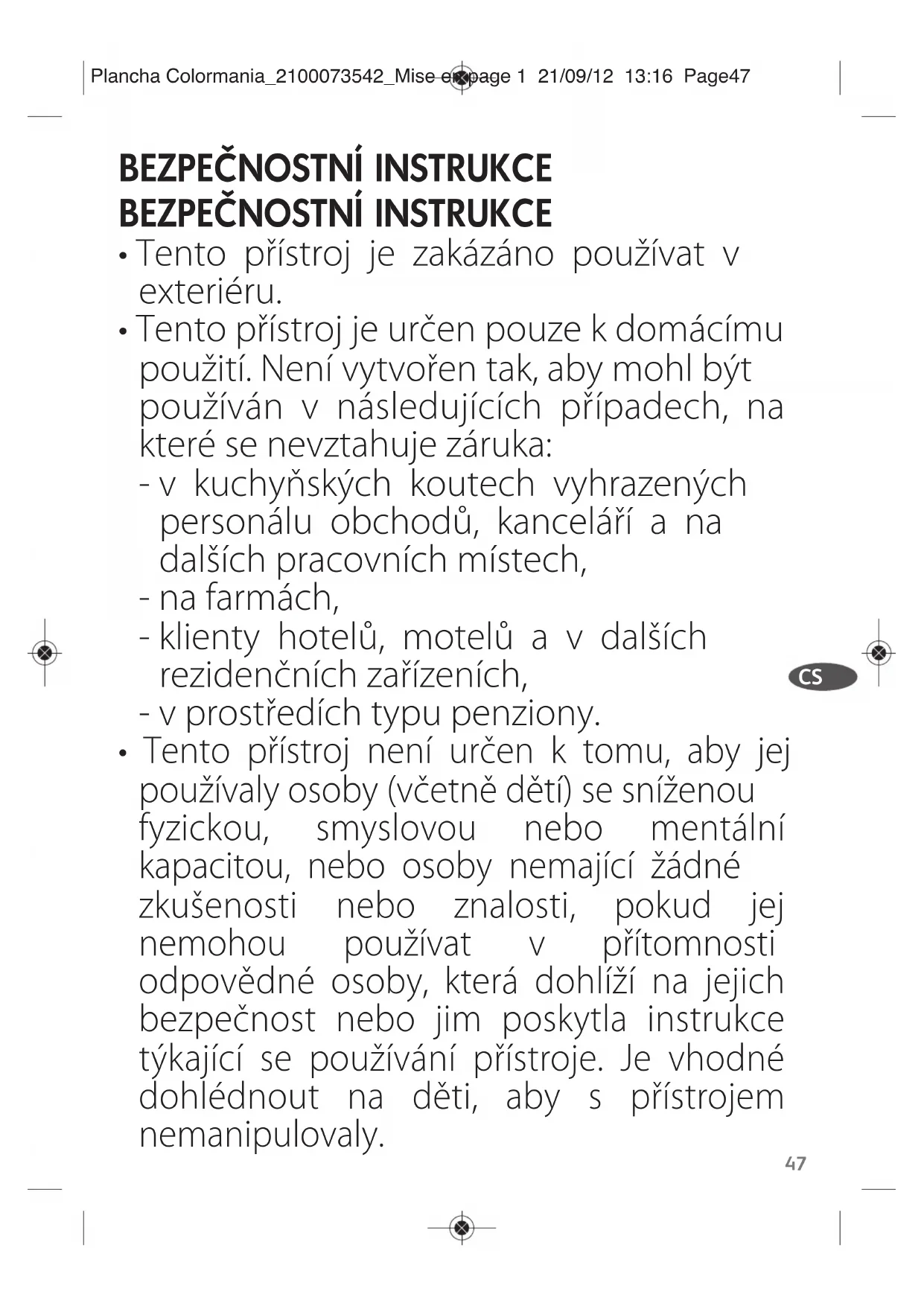- Tento přístroj není určen k tomu, aby jej používaly osoby (včetně dětí) se sníženou fyzickou, smyslovou nebo mentální kapacitou, nebo osoby nemající žádné zkušenosti nebo znalosti, pokud jej nemohou používat v přítomnosti odpovědné osoby, která dohlíží na jejich bezpečnost nebo jim poskytla instrukce týkající se používání přístroje. Je vhodné dohlédnout na děti, aby s přístrojem nemanipulovaly. Plancha Colormania_2100073542_Mise en page 1 21/09/12 13:16 Page4748