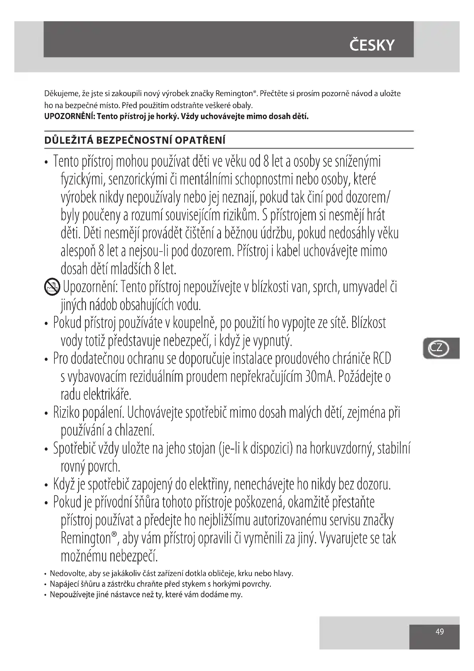 - Pokud je přívodní šňůra tohoto přístroje poškozená, okamžitě přestaňte přístroj používat a předejte ho nejbližšímu autorizovanému servisu značky Remington®, aby vám přístroj opravili či vyměnili za jiný. Vyvarujete se tak možnému nebezpečí.