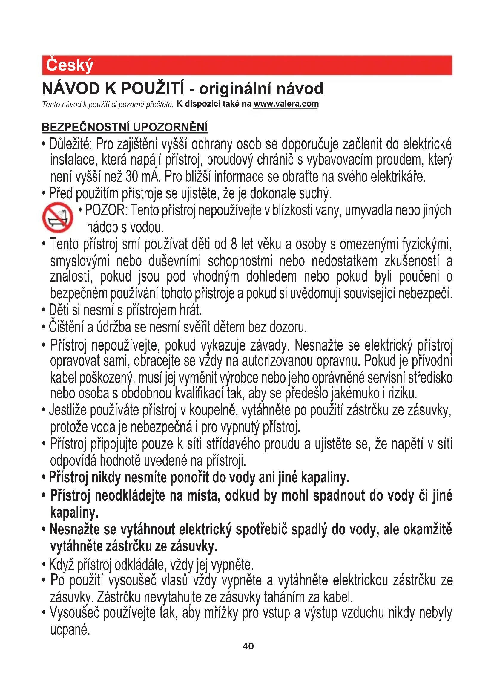 - POZOR: Tento přístroj nepoužívejte v blízkosti vany, umyvadla nebo jiných nádob s vodou.