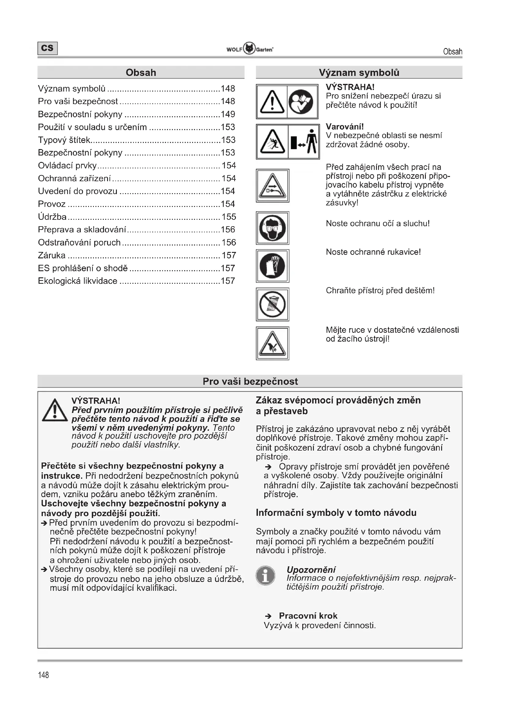 - Ekologická likvidace Význam symbolů VÝSTRAHA! Pro snížení nebezpečí úrazu si přečtěte návod k použití! Varování! V nebezpečné oblasti se nesmí zdržovat žádné osoby. Před zahájením všech prací na přístroji nebo při poškození připo- jovacího kabelu přístroj vypněte a vytáhněte zástrčku z elektrické zásuvky! Noste ochranu očí a sluchu! Noste ochranné rukavice! Chraňte přístroj před deštěm! Mějte ruce v dostatečné vzdálenosti od žacího ústrojí! Pro vaši bezpečnost VÝSTRAHA! Před prvním použitím přístroje si pečlivě přečtěte tento návod k použití a řiďte se všemi v něm uvedenými pokyny. Tento návod k použití uschovejte pro pozdější použití nebo další vlastníky. Přečtěte si všechny bezpečnostní pokyny a instrukce. Při nedodržení bezpečnostních pokynů a návodů může dojít k zásahu elektrickým prou- dem, vzniku požáru anebo těžkým zraněním. Uschovejte všechny bezpečnostní pokyny a návody pro pozdější použití. Î Před prvním uvedením do provozu si bezpodmí- nečně přečtěte bezpečnostní pokyny! Při nedodržení návodu k použití a bezpečnost- ních pokynů může dojít k poškození přístroje a ohrožení uživatele nebo jiných osob. Î Všechny osoby, které se podílejí na uvedení pří- stroje do provozu nebo na jeho obsluze a údržbě, musí mít odpovídající kvalikaci. Zákaz svépomocí prováděných změn a přestaveb Přístroj je zakázáno upravovat nebo z něj vyrábět doplňkové přístroje. Takové změny mohou zapří- činit poškození zdraví osob a chybné fungování přístroje. Î Opravy přístroje smí provádět jen pověřené a vyškolené osoby. Vždy používejte originální náhradní díly. Zajistíte tak zachování bezpečnosti přístroje. Informační symboly v tomto návodu Symboly a značky použité v tomto návodu vám mají pomoci při rychlém a bezpečném použití návodu i přístroje. Upozornění Informace o nejefektivnějším resp. nejprak- tičtějším použití přístroje. Î Pracovní krok Vyzývá k provedení činnosti.Pro vaši bezpečnost p. 157