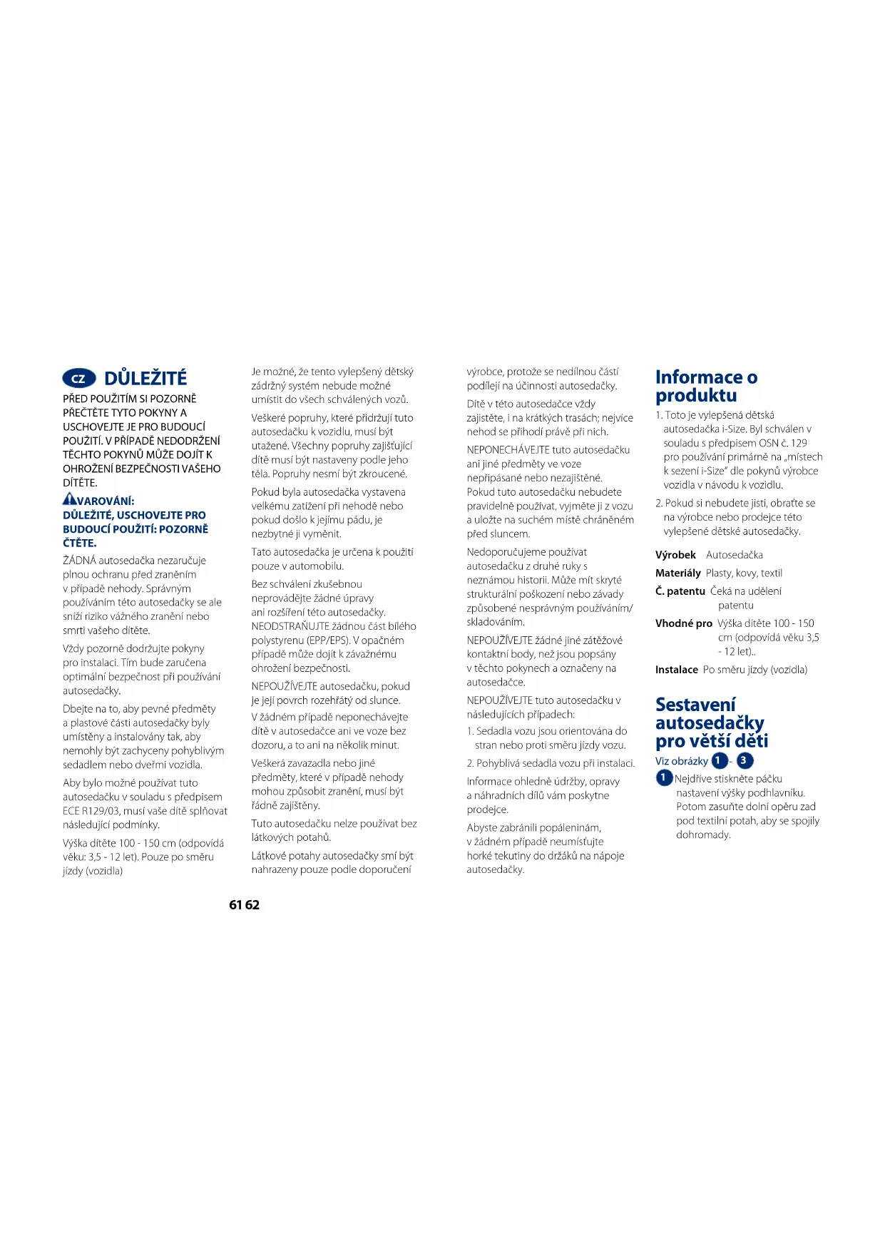 ČTĚTE. ŽÁDNÁ autosedačka nezaručuje plnou ochranu před zraněním v případě nehody. Správným používáním této autosedačky se ale sníží riziko vážného zranění nebo smrti vašeho dítěte. Vždy pozorně dodržujte pokyny pro instalaci. Tím bude zaručena optimální bezpečnost při používání autosedačky. Dbejte na to, aby pevné předměty a plastové části autosedačky byly umístěny a instalovány tak, aby nemohly být zachyceny pohyblivým sedadlem nebo dveřmi vozidla. Aby bylo možné používat tuto autosedačku v souladu s předpisem ECE R129/03, musí vaše dítě splňovat následující podmínky. Výška dítěte 100 - 150 cm (odpovídá věku: 3,5 - 12 let). Pouze po směru jízdy (vozidla) Je možné, že tento vylepšený dětský zádržný systém nebude možné umístit do všech schválených vozů. Veškeré popruhy, které přidržují tuto autosedačku k vozidlu, musí být utažené. Všechny popruhy zajišťující dítě musí být nastaveny podle jeho těla. Popruhy nesmí být zkroucené. Pokud byla autosedačka vystavena velkému zatížení při nehodě nebo pokud došlo k jejímu pádu, je nezbytné ji vyměnit. Tato autosedačka je určena k použití pouze v automobilu. Bez schválení zkušebnou neprovádějte žádné úpravy ani rozšíření této autosedačky. NEODSTRAŇUJTE žádnou část bílého polystyrenu (EPP/EPS). V opačném případě může dojít k závažnému ohrožení bezpečnosti. NEPOUŽÍVEJTE autosedačku, pokud je její povrch rozehřátý od slunce. V žádném případě neponechávejte dítě v autosedačce ani ve voze bez dozoru, a to ani na několik minut. Veškerá zavazadla nebo jiné předměty, které v případě nehody mohou způsobit zranění, musí být řádně zajištěny. Tuto autosedačku nelze používat bez látkových potahů. Látkové potahy autosedačky smí být nahrazeny pouze podle doporučení výrobce, protože se nedílnou částí podílejí na účinnosti autosedačky. Dítě v této autosedačce vždy zajistěte, i na krátkých trasách; nejvíce nehod se přihodí právě při nich. NEPONECHÁVEJTE tuto autosedačku ani jiné předměty ve voze nepřipásané nebo nezajištěné. Pokud tuto autosedačku nebudete pravidelně používat, vyjměte ji z vozu a uložte na suchém místě chráněném před sluncem. Nedoporučujeme používat autosedačku z druhé ruky s neznámou historii. Může mít skryté strukturální poškození nebo závady způsobené nesprávným používáním/ skladováním. NEPOUŽÍVEJTE žádné jiné zátěžové kontaktní body, než jsou popsány v těchto pokynech a označeny na autosedačce. NEPOUŽÍVEJTE tuto autosedačku v následujících případech: