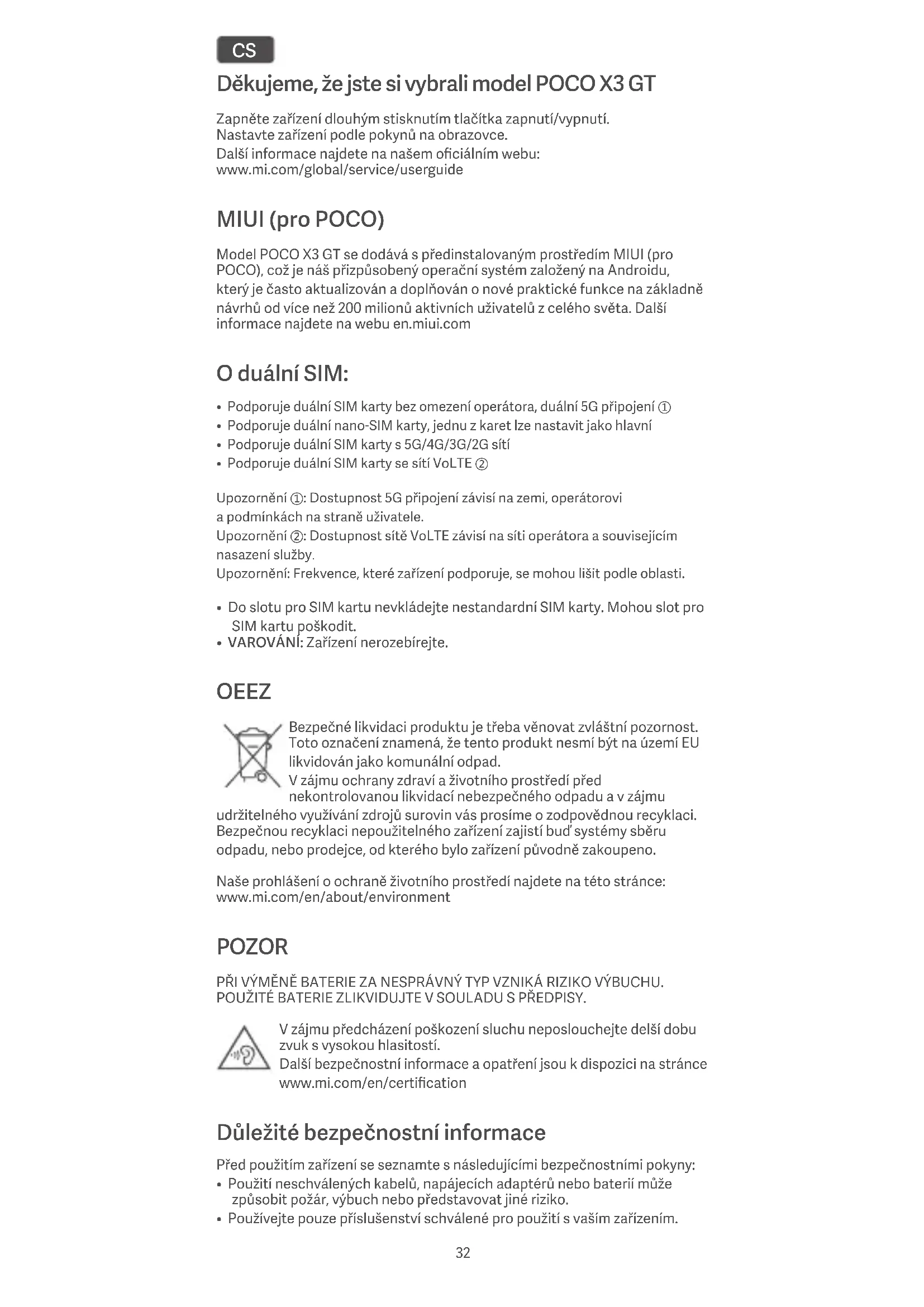 - VAROVÁNÍ: Zařízení nerozebírejte. OEEZ Bezpečné likvidaci produktu je třeba věnovat zvláštní pozornost. Toto označení znamená, že tento produkt nesmí být na území EU likvidován jako komunální odpad. V zájmu ochrany zdraví a životního prostředí před nekontrolovanou likvidací nebezpečného odpadu a v zájmu udržitelného využívání zdrojů surovin vás prosíme o zodpovědnou recyklaci. Bezpečnou recyklaci nepoužitelného zařízení zajistí buď systémy sběru odpadu, nebo prodejce, od kterého bylo zařízení původně zakoupeno. Naše prohlášení o ochraně životního prostředí najdete na této stránce: www.mi.com/en/about/environment POZOR PŘI VÝMĚNĚ BATERIE ZA NESPRÁVNÝ TYP VZNIKÁ RIZIKO VÝBUCHU. POUŽITÉ BATERIE ZLIKVIDUJTE V SOULADU S PŘEDPISY. V zájmu předcházení poškození sluchu neposlouchejte delší dobu zvuk s vysokou hlasitostí. Další bezpečnostní informace a opatření jsou k dispozici na stránce www.mi.com/en/certification Důležité bezpečnostní informace Před použitím zařízení se seznamte s následujícími bezpečnostními pokyny: