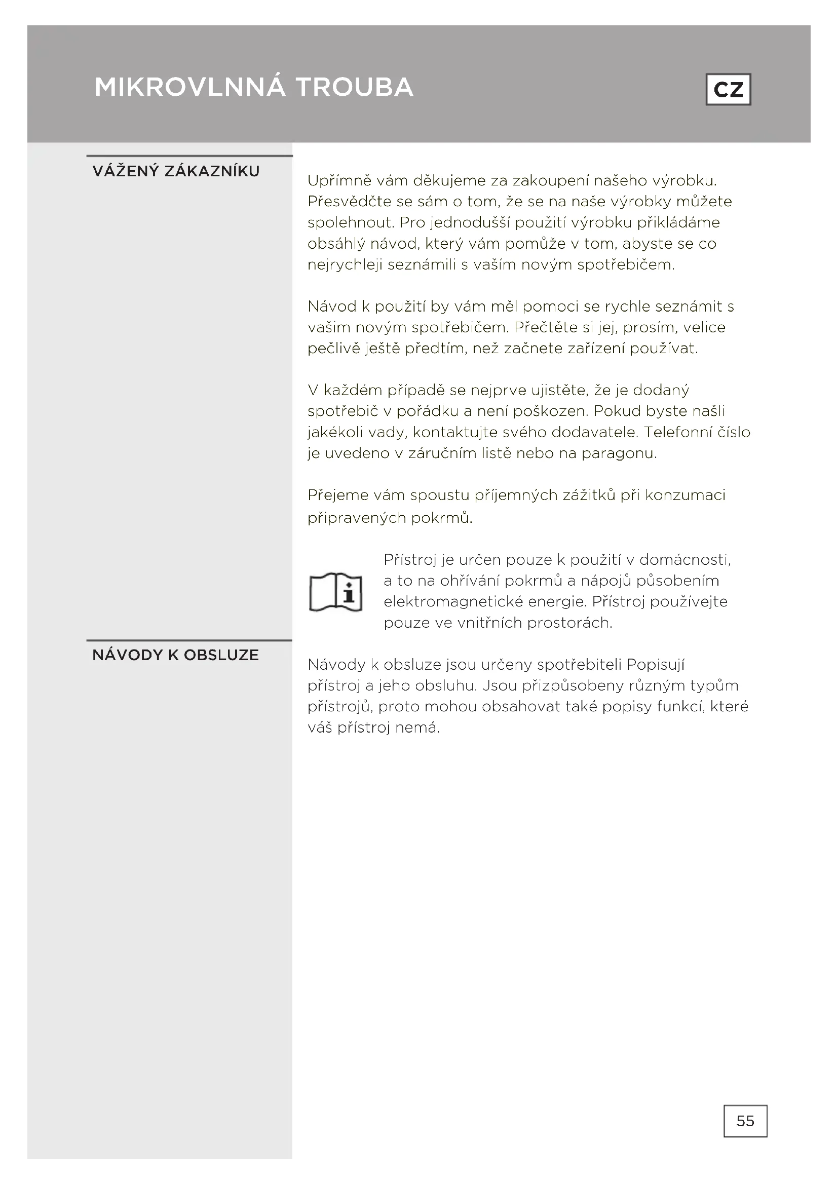 Upřímně vám děkujeme za zakoupení našeho výrobku. Přesvědčte se sám o tom, že se na naše výrobky můžete spolehnout. Pro jednodušší použití výrobku přikládáme obsáhlý návod, který vám pomůže v tom, abyste se co nejrychleji seznámili s vaším novým spotřebičem. Návod k použití by vám měl pomoci se rychle seznámit s vašim novým spotřebičem. Přečtěte si jej, prosím, velice pečlivě ještě předtím, než začnete zařízení používat. V každém případě se nejprve ujistěte, že je dodaný spotřebič v pořádku a není poškozen. Pokud byste našli jakékoli vady, kontaktujte svého dodavatele. Telefonní číslo je uvedeno v záručním listě nebo na paragonu. Přejeme vám spoustu příjemných zážitků při konzumaci připravených pokrmů. Přístroj je určen pouze k použití v domácnosti, a to na ohřívání pokrmů a nápojů působením elektromagnetické energie. Přístroj používejte pouze ve vnitřních prostorách. Návody k obsluze jsou určeny spotřebiteli Popisují přístroj a jeho obsluhu. Jsou přizpůsobeny různým typům přístrojů, proto mohou obsahovat také popisy funkcí, které váš přístroj nemá.