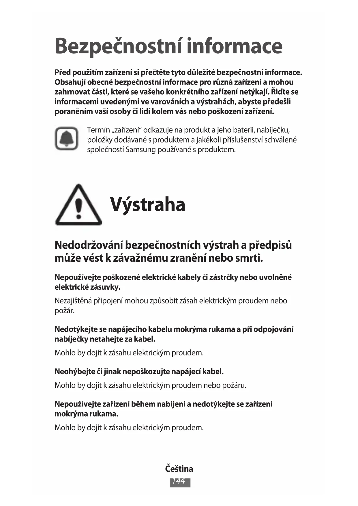 Bezpečnostní informace Před použitím zařízení si přečtěte tyto důležité bezpečnostní informace. Obsahují obecné bezpečnostní informace pro různá zařízení a mohou zahrnovat části, které se vašeho konkrétního zařízení netýkají. Řiďte se informacemi uvedenými ve varováních a výstrahách, abyste předešli poraněním vaší osoby či lidí kolem vás nebo poškození zařízení.Termín „zařízení“ odkazuje na produkt a jeho baterii, nabíječku, položky dodávané s produktem a jakékoli příslušenství schválené společností Samsung používané s produktem. Výstraha Nedodržování bezpečnostních výstrah a předpisů může vést k závažnému zranění nebo smrti. Nepoužívejte poškozené elektrické kabely či zástrčky nebo uvolněné elektrické zásuvky.Nezajištěná připojení mohou způsobit zásah elektrickým proudem nebo požár.Nedotýkejte se napájecího kabelu mokrýma rukama a při odpojování nabíječky netahejte za kabel.Mohlo by dojít k zásahu elektrickým proudem.Neohýbejte či jinak nepoškozujte napájecí kabel.Mohlo by dojít k zásahu elektrickým proudem nebo požáru.Nepoužívejte zařízení během nabíjení a nedotýkejte se zařízení mokrýma rukama.Mohlo by dojít k zásahu elektrickým proudem.Čeština