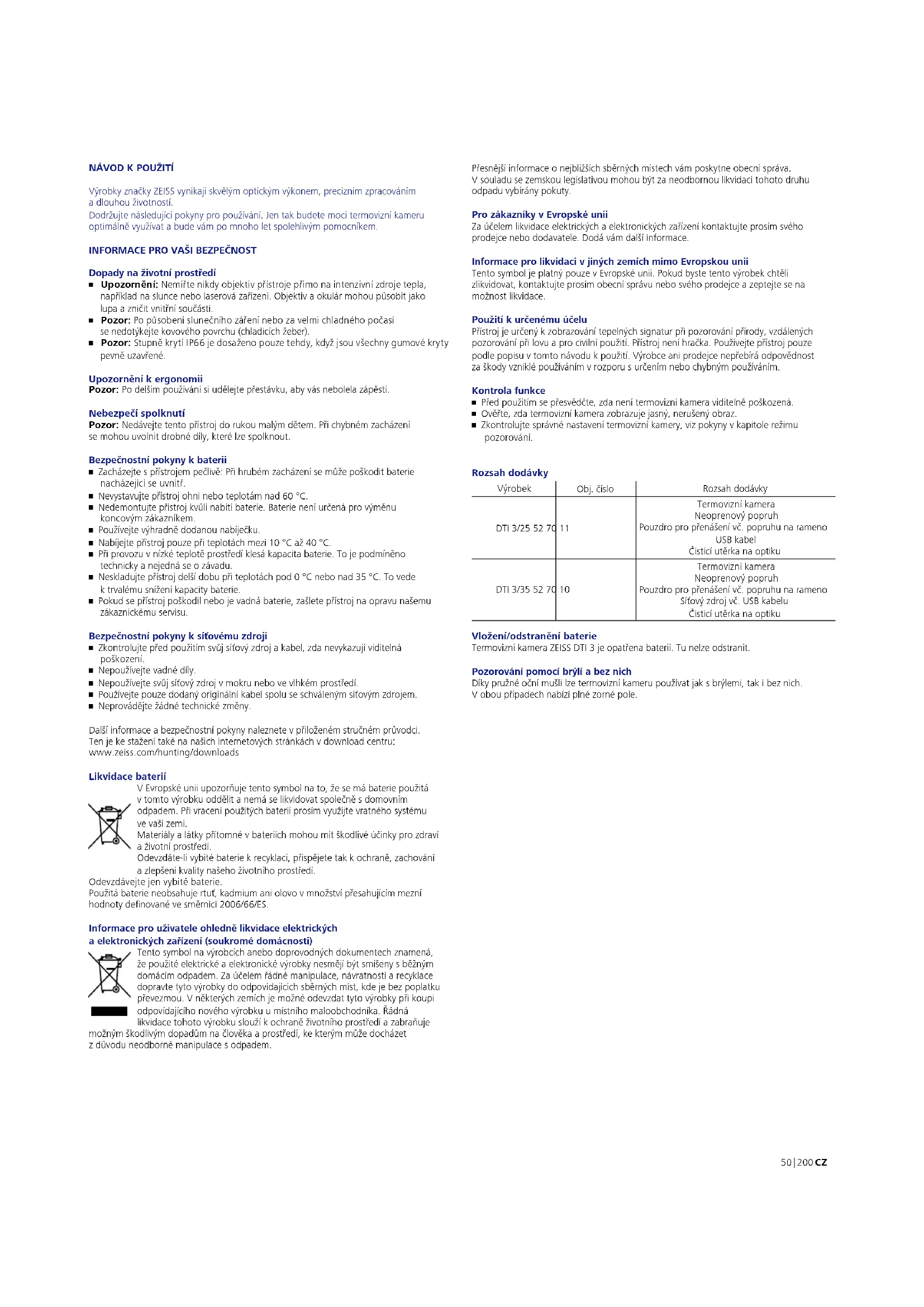 - Neprovádějte žádné technické změny. Další informace abezpečnostní pokyny naleznete vpřiloženém stručném průvodci. Ten je ke stažení také na našich internetových stránkách vdownload centru: www.zeiss.com/hunting/downloads Likvidace baterií V Evropské unii upozorňuje tento symbol na to, že semá baterie použitá vtomto výrobku oddělit anemá selikvidovat společně s domovním odpadem. Při vracení použitých baterií prosím využijte vratného systému ve vaší zemi. Materiály alátky přítomné vbateriích mohou mít škodlivé účinky pro zdraví aživotní prostředí. Odevzdáte-li vybité baterie k recyklaci, přispějete tak k ochraně, zachování azlepšení kvality našeho životního prostředí. Odevzdávejte jen vybité baterie. Použitá baterie neobsahuje rtuť, kadmium ani olovo vmnožství přesahujícím mezní hodnoty denované ve směrnici 2006/66/ES. Informace pro uživatele ohledně likvidace elektrických a elektronických zařízení (soukromé domácnosti) Tento symbol na výrobcích anebo doprovodných dokumentech znamená, že použité elektrické aelektronické výrobky nesmějí být smíšeny s běžným domácím odpadem. Za účelem řádné manipulace, návratnosti arecyklace dopravte tyto výrobky do odpovídajících sběrných míst, kde je bez poplatku převezmou. Vněkterých zemích je možné odevzdat tyto výrobky při koupi odpovídajícího nového výrobku u místního maloobchodníka. Řádná likvidace tohoto výrobku slouží k ochraně životního prostředí azabraňuje možným škodlivým dopadům na člověka aprostředí, ke kterým může docházet zdůvodu neodborné manipulace s odpadem. Přesnější informace o nejbližších sběrných místech vám poskytne obecní správa. Vsouladu sezemskou legislativou mohou být za neodbornou likvidaci tohoto druhu odpadu vybírány pokuty. Pro zákazníky vEvropské unii Za účelem likvidace elektrických aelektronických zařízení kontaktujte prosím svého prodejce nebo dodavatele. Dodá vám další informace. Informace pro likvidaci vjiných zemích mimo Evropskou unii Tento symbol je platný pouze vEvropské unii. Pokud byste tento výrobek chtěli zlikvidovat, kontaktujte prosím obecní správu nebo svého prodejce azeptejte sena možnost likvidace. Použití kurčenému účelu Přístroj je určený k zobrazování tepelných signatur při pozorování přírody, vzdálených pozorování při lovu apro civilní použití. Přístroj není hračka. Používejte přístroj pouze podle popisu vtomto návodu k použití. Výrobce ani prodejce nepřebírá odpovědnost za škody vzniklé používáním vrozporu s určením nebo chybným používáním. Kontrola funkce