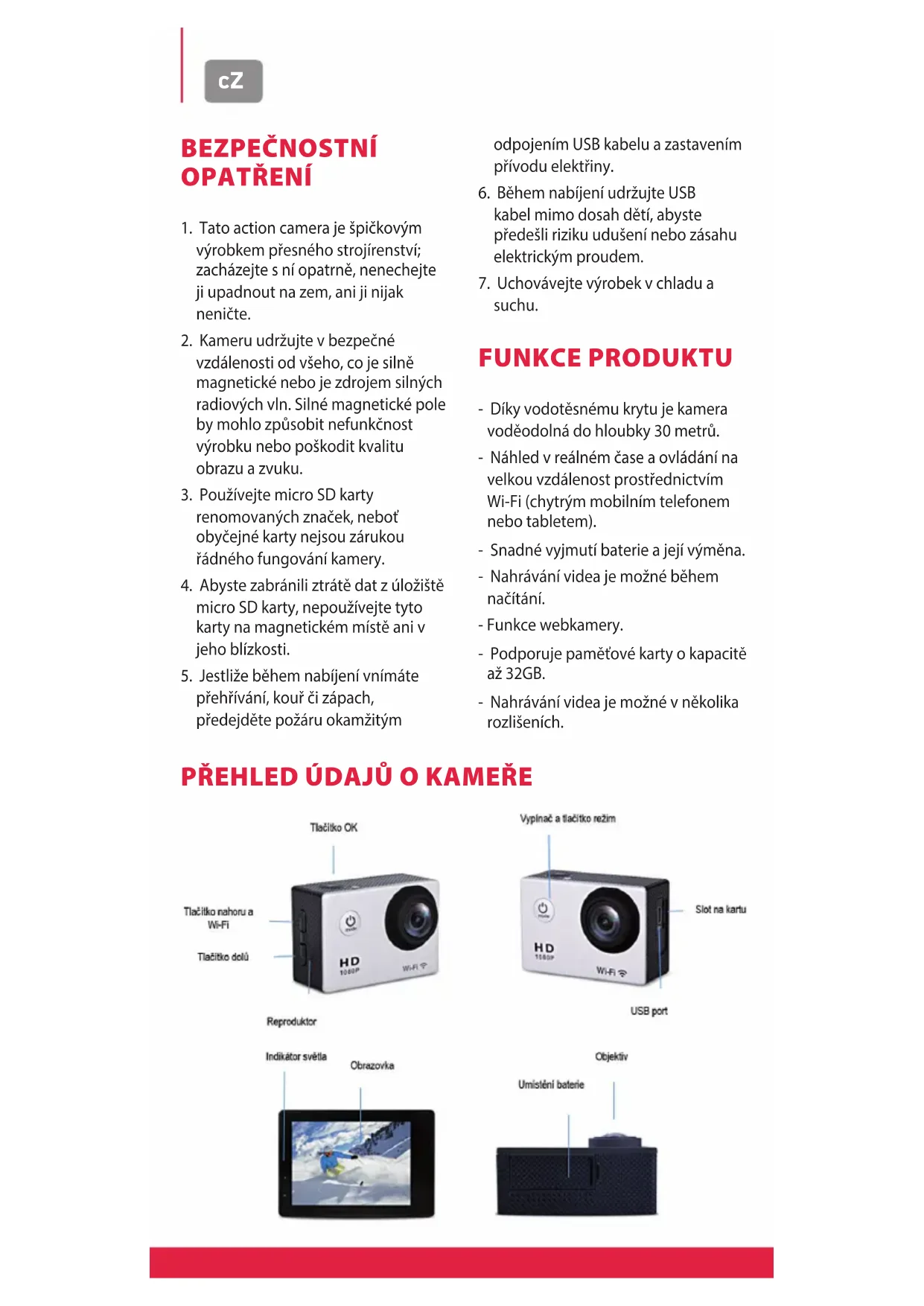 - Tato action camera je špičkovým výrobkem presného strojírenstvi; zacházejte s n opatrě, nenechejte ji upadnout na zem, ani ji nihiluk nenićte.