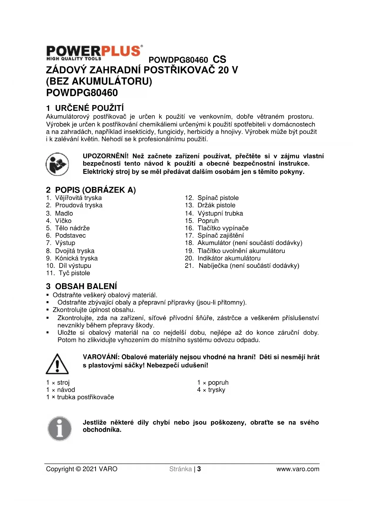 - Uložte si obalový materiál na co nejdelší dobu, nejlépe až do konce záruční doby. Potom ho zlikvidujte vyhozením do místního systému odvozu odpadu. VAROVÁNÍ: Obalové materiály nejsou vhodné na hraní! Děti si nesmějí hrát s plastovými sáčky! Nebezpečí udušení! 1 × stroj 1 × návod 1 × trubka postřikovače 1 × popruh 4 × trysky Jestliže některé díly chybí nebo jsou poškozeny, obraťte se na svého obchodníka.POWDPG80460 CS Copyright © 2021 VARO Stránka | 4 www.varo.com 4 SYMBOLY V tomto návodu a na stroji jsou používány následující symboly: