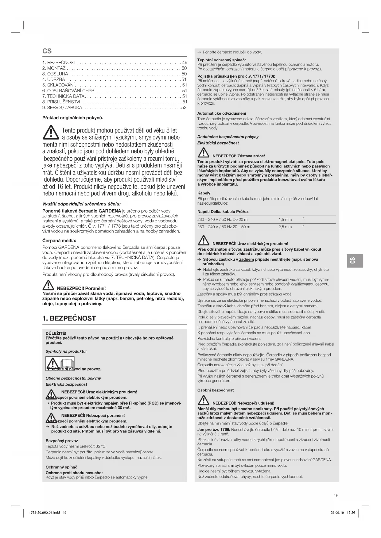 Překlad originálních pokynů. Tento produkt mohou používat děti od věku 8 let aosoby se sníženými fyzickými, smyslovými nebo mentálními schopnostmi nebo nedostatkem zkušeností aznalostí, pokud jsou pod dohledem nebo byly ohledně bezpečného používání přístroje zaškoleny a rozumí tomu, jaké nebezpečí z toho vyplývá. Děti si s produktem nesmějí hrát. Čištění a uživatelskou údržbu nesmí provádět děti bez dohledu. Doporučujeme, aby produkt používali mladiství až od 16 let. Produkt nikdy nepoužívejte, pokud jste unavení nebo nemocní nebo pod vlivem drog, alkoholu nebo léků. Využití odpovídající určenému účelu: Ponorné tlakové čerpadlo GARDENA je určeno pro odběr vody ze studní, šachet a jiných vodních rezervoárů, pro provoz zavlažovacích zařízení a systémů, a také pro čerpání dešťové vody, vody z vodovodu avody obsahující chlór. Č.v. 1771 / 1773 jsou také určeny pro zásobo- vánívodou na soukromých domácích zahradách a na hobby zahradách. Čerpaná média: Pomocí GARDENA ponorného tlakového čerpadla se smí čerpat pouze voda. Čerpadlu nevadí zaplavení vodou (vodotěsné) a je určené k ponoření do vody (max. ponorná hloubka viz 7. TECHNICKÁ DATA). Čerpadlo je vybavené integrovanou zpětnou klapkou, která zabraňuje samovypuštění tlakové hadice po uvedení čerpadla mimo provoz. Produkt není vhodný pro dlouhodobý provoz (trvalý cirkulační provoz).