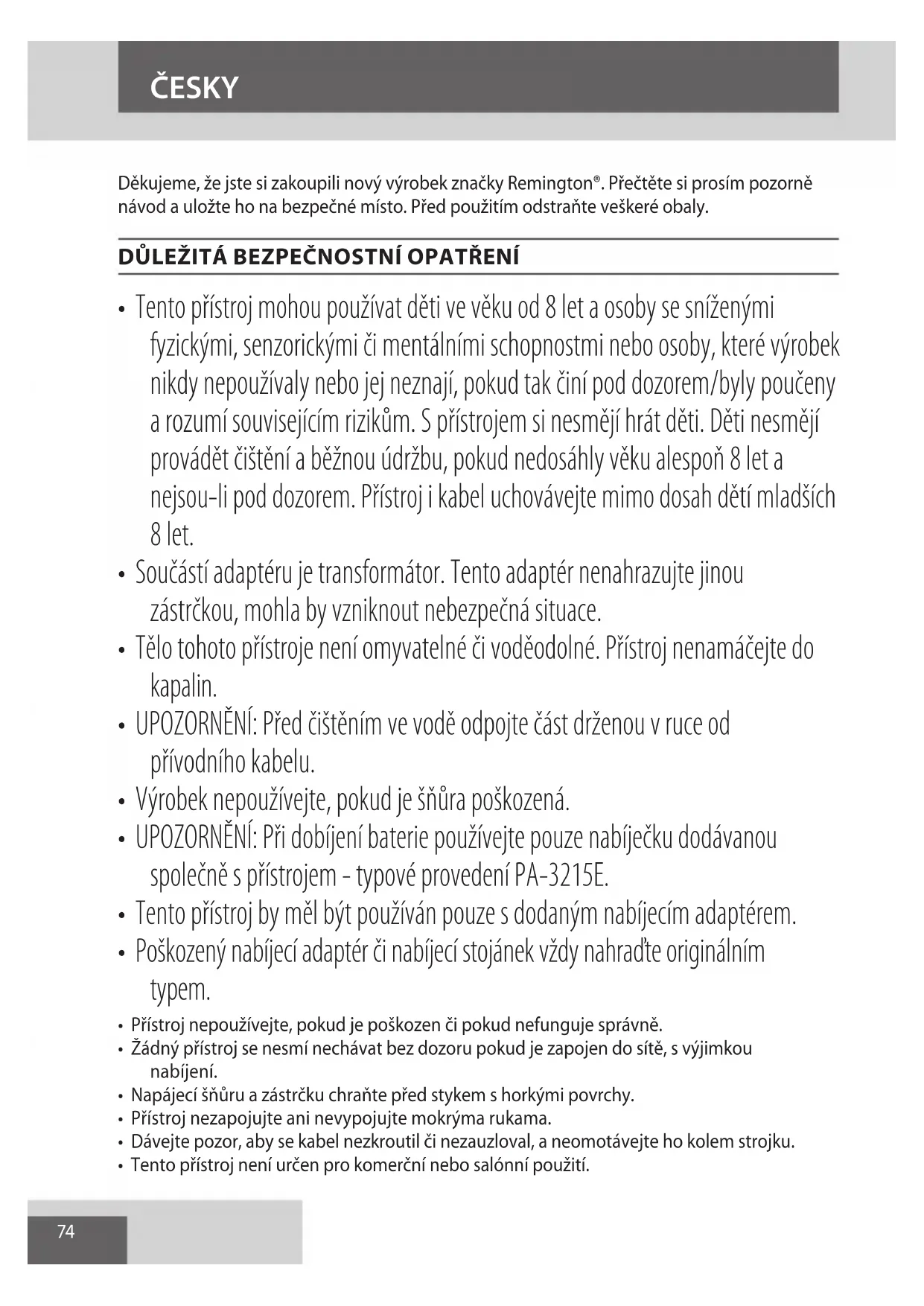 AE74 Děkujeme, že jste si zakoupili nový výrobek značky Remington®. Přečtěte si prosím pozorně návod a uložte ho na bezpečné místo. Před použitím odstraňte veškeré obaly. DŮLEŽITÁ BEZPEČNOSTNÍ OPATŘENÍ