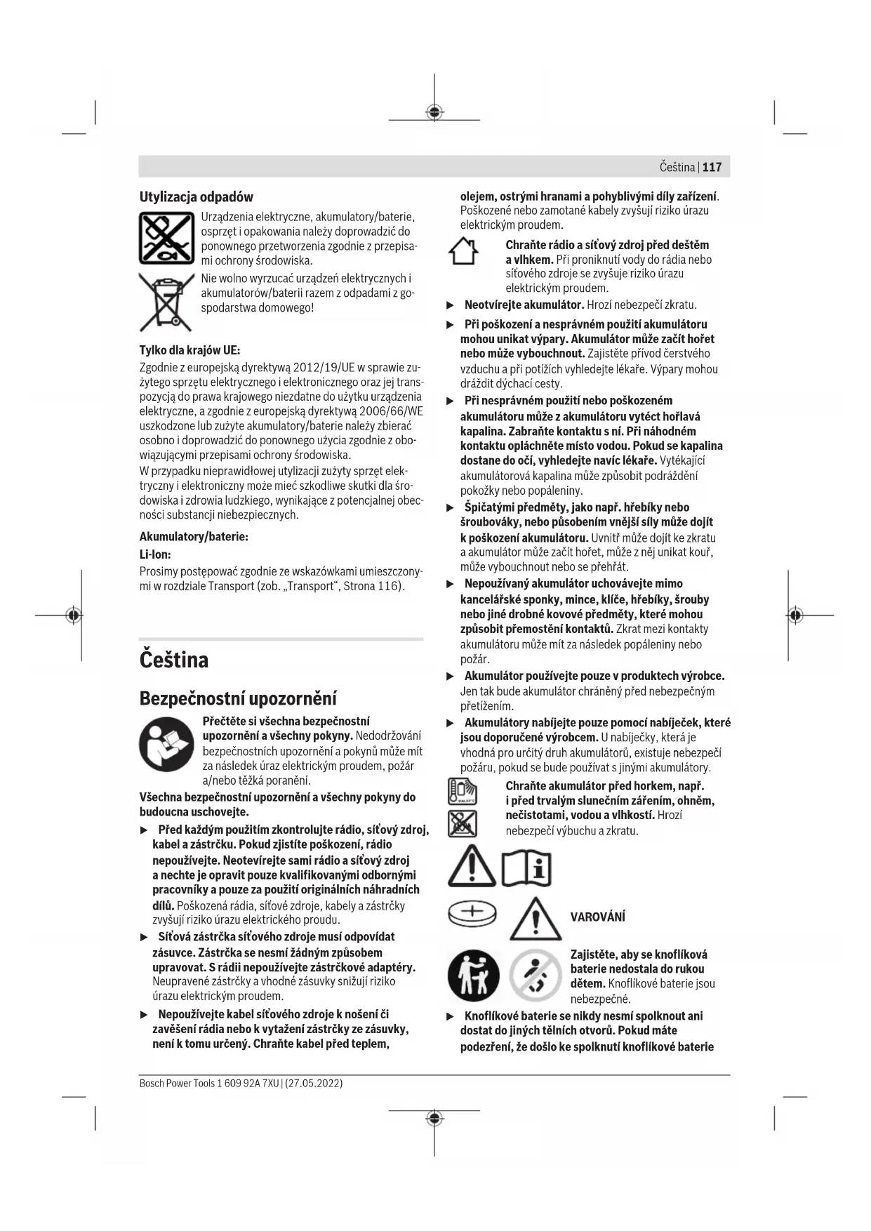 Další technické údaje najdete na: https://www.bosch-professional.com/ecodesign Napájení rádia Rádio lze napájet pomocí lithium-iontového akumulátoru(17) nebo síťového zdroje(20). Provoz sakumulátorem u Používejte pouze nabíječky uvedené vtechnických údajích. Jen tyto nabíječky jsou přizpůsobené pro lithium-iontový akumulátor, který lze používat svaším rádiem. Upozornění: Používání akumulátorů, které nejsou vhodné pro vaše rádio, může vést knesprávným funkcím nebo kpoškození rádia. Lithium-iontový akumulátor je díky „Electronic Cell Protection (ECP)“ chráněný proti hlubokému vybití. Při vybitém akumulátoru se rádio vypne díky ochrannému vypnutí. u Pokud dojde kvypnutí rádia ochranným vypnutím, nezapínejte ho znovu. Akumulátor se může poškodit. Výměna akumulátoru Otevřete zajišťovací páčku(13) krytu akumulátoru aodklopte kryt akumulátoru(12). Pro vyjmutí akumulátoru stiskněte odjišťovací tlačítko akumulátoru(16) avytáhněte akumulátor zpřihrádky pro akumulátor. Nepoužívejte přitom násilí. Pro nasazení zasuňte akumulátor do uchycení akumulátoru(14) tak, aby přípojky akumulátoru doléhaly kpřípojkám uchycení akumulátoru. Nechte akumulátor zaskočit. Zavřete kryt akumulátoru(12) azajistěte ho. Ukazatel stavu nabití akumulátoru Při nasazeném akumulátoru můžete zjistit stav nabití akumulátoru(17) na displeji, při vyjmutém akumulátoru na samotném akumulátoru. Ukazatel stavu nabití akumulátoru na displeji Ukazatel stavu nabití akumulátoru(i) se zobrazí na displeji, jakmile je nasazený akumulátor sdostatečným napětím arádio není pomocí síťového zdroje(20) připojené kelektrické síti. Ukazatel Kapacita 80–100% 60–80% Bosch Power Tools 1 609 92A 7XU | (27.05.2022)120 | Čeština Ukazatel Kapacita 40–60% 20–40% 5–20% 0–5% Ukazatel stavu nabití akumulátoru na akumulátoru Při vyjmutí akumulátoru zrádia si lze stav nabití zobrazit pomocí zelených LED ukazatele stavu nabití na akumulátoru. Pro zobrazení stavu nabití stiskněte tlačítko ukazatele stavu nabití nebo . Pokud po stisknutí tlačítka ukazatele stavu nabití nesvítí žádná LED, je akumulátor vadný amusí se vyměnit. Typ akumulátoru GBA 18V... LED Kapacita Trvale svítí tři zelené 60−100% Trvale svítí dvě zelené 30−60% Trvale svítí jedna zelená 5−30% Bliká jedna zelená 0−5% Typ akumulátoru ProCORE18V... LED Kapacita Trvale svítí pět zelených 80−100 % Trvale svítí čtyři zelené 60−80 % Trvale svítí tři zelené 40−60 % Trvale svítí dvě zelené 20−40 % Trvale svítí jedna zelená 5−20 % Bliká jedna zelená 0−5 % Provoz se síťovým zdrojem (vizobrázekA) u Používejte pouze síťové zdroje uvedené vtechnických údajích. Jen tak je možný bezproblémový provoz rádia. u Dbejte na správné síťové napětí! Napětí zdroje proudu musí souhlasit súdaji na typovém štítku síťového zdroje. Otevřete ochrannou krytku přípojek(15). Zapojte konektor(21) síťového zdroje do připojovací zdířky(22) (DCIN18V). Síťový zdroj připojte kelektrické síti. Po odpojení konektoru(21) kvůli ochraně před znečištěním znovu uzavřete ochrannou krytku přípojek(15). Výměna knoflíkové baterie Pro uložení času adalších nastavení rádia musí být nasazena knoflíková baterie jako záložní baterie. Před prvním uvedením rádia do provozu odstraňte ochranný pásek nasazené knoflíkové baterie. Otevřete zajišťovací páčku(13) krytu akumulátoru aodklopte kryt akumulátoru(12). Vpřípadě potřeby vyjměte akumulátor(17). Vytáhněte ochranný pásek pod krytem(18) knoflíkové baterie. Když není vrádiu uložený čas aukazatel slábne, vyměňte knoflíkovou baterii. Za tímto účelem otočte kryt(18) knoflíkové baterie proti směru hodinových ručiček (např. pomocí mince) akryt sejměte. Nasaďte novou knoflíkovou baterii. Přitom dodržujte správnou polaritu podle vyobrazení na vnitřní straně krytu(18). Znovu nasaďte kryt(18) knoflíkové baterie autáhněte ho po směru hodinových ručiček. Kryt je bezpečně zajištěný pouze tehdy, když značky na krytu ausymbolu zámku ukazují proti sobě. u Pokud rádio delší dobu nepoužíváte, vyjměte zněj knoflíkovou baterii. Knoflíková baterie může při delším skladování vrádiu korodovat asama se vybít. Provoz u Chraňte rádio před přímým kontaktem svodou. Při proniknutí vody do rádia se zvyšuje riziko úrazu elektrickým proudem. u Kryt akumulátoru aochranná krytka přípojek by měly být pokud možno zavřené. Uzavřené kryty chrání rádio před vodou aprachem. Audiorežim Zapnutí avypnutí Pro zapnutí rádia stiskněte tlačítko zapnutí/vypnutí(2). Displej(1) se aktivuje azačne se přehrávat audiozdroj nastavený při posledním vypnutí rádia. Displej(1) se při každém stisknutí tlačítka na několik sekund rozsvítí. Pro vypnutí rádia znovu stiskněte tlačítko zapnutí/ vypnutí(2). Aktuální nastavení audiozdroje se uloží. Nastavení hlasitosti Po zapnutí rádia je vždy nastavená nízká hlasitost. Pro zvýšení hlasitosti otáčejte tlačítkem zapnutí/vypnutí(2) po směru hodinových ručiček, pro snížení hlasitosti proti směru hodinových ručiček. Nastavená hlasitost <VL>, resp. <Volume> se na několik sekund zobrazí na displeji shodnotou0 až30. Před nastavením nebo změnou rozhlasové stanice nastavte hlasitost na nízkou hodnotu, před spuštěním externího audiozdroje na střední hodnotu. Pro vypnutí zvuku můžete krátce stisknout tlačítko ztlumení(8). Pro opětovné zapnutí zvuku buď znovu krátce 1 609 92A 7XU | (27.05.2022) Bosch Power ToolsČeština | 121 stiskněte tlačítko ztlumení, nebo otáčejte tlačítkem zapnutí/ vypnutí(2) po směru hodinových ručiček. Hlasitost lze kdykoli změnit. Kd
