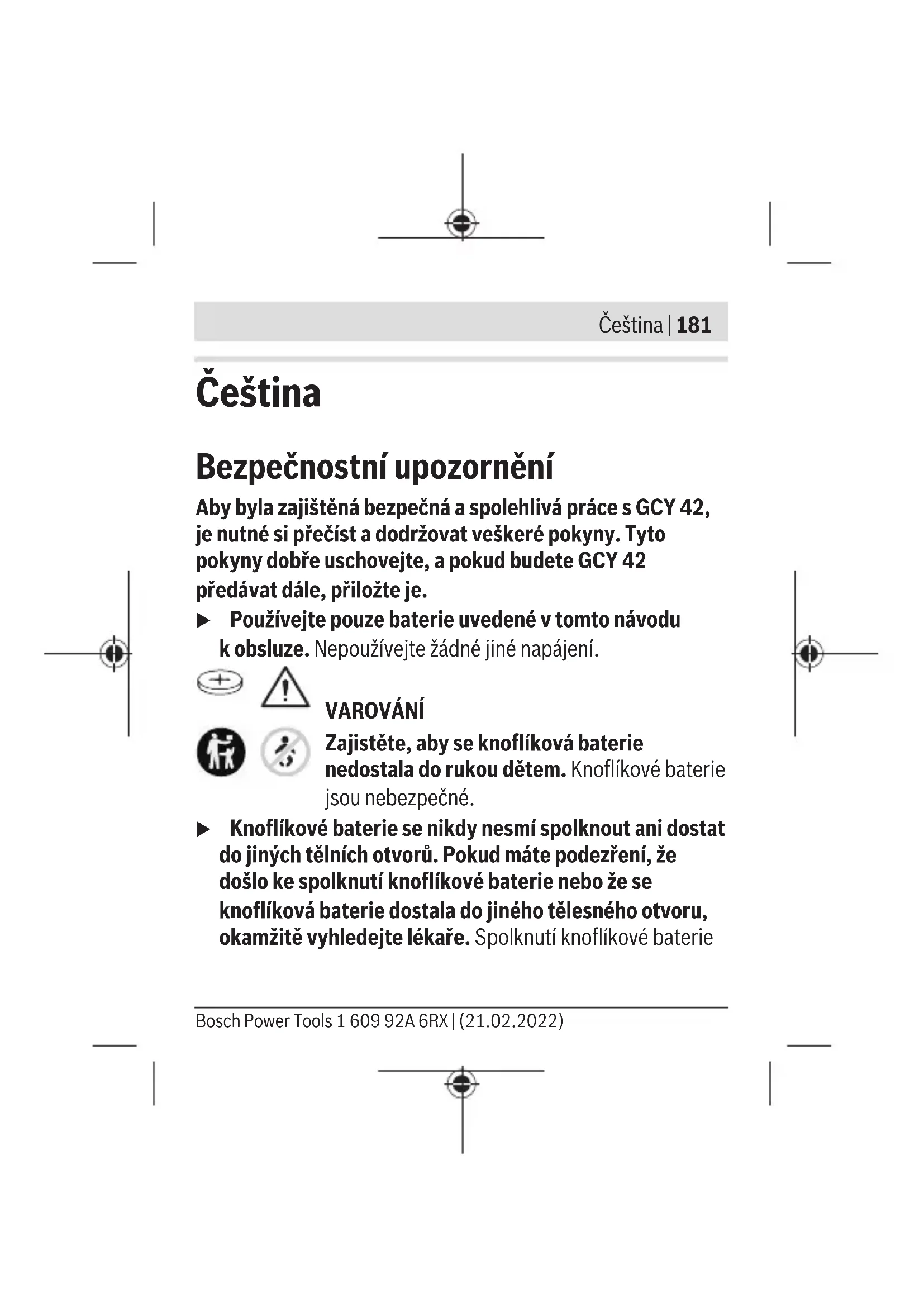 Dosah se může výrazně lišit podle vnějších podmínek, včetně použitého přijímače. Uvnitř uzavřených prostorů avlivem kovových bariér (např. zdí, regálů, kufrů) může být dosah Bluetooth® výrazně menší. Systémové předpoklady GCY 42 Mobilní koncové zařízení (tablet, chytrý telefon) Android6.0 (avyšší) iOS11 (avyšší) Montáž aprovoz Napájení u Např. pomocí šroubováku nebo velké mince odstraňte kryt pro Bluetooth® Low Energy Module GCY 42 na 1 609 92A 6RX | (21.02.2022) Bosch Power ToolsČeština | 187 elektrickém nářadí. Použitím nevhodných předmětů může dojít kpoškození elektroniky nebo krytu. – Při uvedení do provozu po zakoupení nebo při výměně baterie (1) postupujte podle vyobrazení na stránkách sobrázky. Dodržujte přitom následující pokyny. První uvedení do provozu (viz obrázky A1–A5) Upozornění: Výplň (3) místo GCY42 dobře uschovejte. Při předávání elektrického nářadí bez GCY 42 znovu nasaďte výplň. Vložte baterii (1) plusovým pólem nahoru do GCY 42 (2). Baterii není nutné zatlačit; baterie sama zaskočí. Až po zavření krytu se sama zafixuje vurčené poloze. Pro inicializaci GCY42 po vložení stiskněte vypínač elektrického nářadí. Výměna baterie (viz obrázky B1–B4) Vybitou baterii (1) vyjímejte jen pomocí prstů. Před úplným vybitím baterie se vaplikaci zobrazí varování. Vyjmutí GCY 42 (viz obrázky C1–C2) Bosch Power Tools 1 609 92A 6RX | (21.02.2022)188 | Čeština Při odstraňování GCY42 (2) nepoužívejte násilí. Nepoužívejte špičaté nebo ostré nástroje. Upozornění: Pro jednodušší vyjmutí GCY42 elektrické nářadí případně obraťte. Uvedení do provozu Jakmile je vložená baterie (1) astisknete vypínač na elektrickém nářadí, GCY42 nepřetržitě vysílá signál. Signál Bluetooth® se přeruší teprve tehdy, když je baterie vybitá nebo vadná nebo když ji vyjmete. Další informace najdete přímo vaplikaci Bosch. Instalace anastavení aplikace Abyste mohli GCY42 používat, musíte nejprve nainstalovat aplikaci Bosch Toolbox. – Aplikaci Bosch Toolbox si stáhněte vpříslušném obchodě saplikacemi (Apple App Store, Google Play Store). Upozornění: Předpokladem je uživatelský účet vpříslušném obchodě saplikacemi. – Poté zvolte vaplikaci položku nabídky MyTools. 1 609 92A 6RX | (21.02.2022) Bosch Power ToolsČeština | 189 – Na displeji vašeho mobilního koncového zařízení se budou zobrazovat všechny další kroky pro spojení elektrického nářadí skoncovým zařízením. Upozornění: Nejprve se kompletně seznamte snávodem aplikace. Získáte tím lepší přehled oprocesu spojení apoužívání funkcí konektivity. Přenos dat přes Bluetooth® GCY42 má pravidelný vysílací interval. Vzávislosti na prostředí to může vyžadovat několik vysílacích intervalů, než bude GCY42 rozpoznán. Pokud není GCY42 rozpoznán, zkontrolujte následující: – Není vzdálenost od mobilního zařízení příliš velká? Zmenšete vzdálenost mezi mobilním koncovým zařízením aGCY42. – Není baterie slabá nebo vybitá? Vyměňte baterii. – Vypněte aznovu zapněte Bluetooth® na mobilním koncovém zařízení. Zkontrolujte, zda nyní dojde krozpoznání GCY42. Bosch Power Tools 1 609 92A 6RX | (21.02.2022)190 | Čeština Údržba aservis Údržba ačištění Štětcem odstraňte nečistoty. Nepoužívejte čisticí prostředky nebo rozpouštědla. Zákaznická služba aporadenství ohledně použití Zákaznická služba zodpoví vaše dotazy kopravě aúdržbě vašeho výrobku atéž knáhradním dílům. Rozkladové výkresy ainformace onáhradních dílech najdete také na: www.bosch- pt.com Vpřípadě dotazů knašim výrobkům apříslušenství vám ochotně pomůže poradenský tým Bosch. Vpřípadě veškerých otázek aobjednávek náhradních dílů bezpodmínečně uveďte 10místné věcné číslo podle typového štítku výrobku. Czech Republic Robert Bosch odbytová s.r.o. Bosch Service Center PT K Vápence 1621/16 692 01 Mikulov Na www.bosch-pt.cz si si můžete objednat opravu Vašeho 1 609 92A 6RX | (21.02.2022) Bosch Power ToolsČeština | 191 stroje nebo náhradní díly online. Tel.: +420 519 305700 Fax: +420 519 305705 E-Mail: servis.naradi@cz.bosch.com www.bosch-pt.cz Další adresy servisů najdete na: www.bosch-pt.com/serviceaddresses Likvidace Modul GCY42, příslušenství aobaly odevzdejte kekologické recyklaci. Elektronické součástky abaterie nevyhazujte do komunálního odpadu! Pouze pro zeměEU: Podle evropské směrnice 2012/19/EU oodpadních elektrických aelektronických zařízeních ajejího provedení ve vnitrostátním právu se musí již nepoužitelné elektrické nářadí apodle evropské směrnice 2006/66/ES vadné nebo opotřebované akumulátory/baterie shromažďovat odděleně aodevzdat kekologické recyklaci. Bosch Power Tools 1 609 92A 6RX | (21.02.2022)192 | Slovenčina Při nesprávné likvidaci mohou odpadní elektrická aelektronická zařízení kvůli případnému obsahu nebezpečných látek poškodit životní prostředí alidské zdraví. Slovenčina Bezpečnostné upozornenia Aby bola zaistená bezpečná aspoľahlivá práca sGCY42, je nevyhnutné prečítať si adodržiavať všetky pokyny. Tieto pokyny dobre uschovajte aak budeteGCY42 odovzdávať ďalej, priložte ich. u Používajte len batérie uvedené vtomto návode na ob- sluhu. Nepoužívajte žiadne iné elektrické napájanie. VÝSTRAHA Zabezpečte, aby sa gombíková batéria nedostala do rúk deťom. Gombíkové batérie sú nebezpečné. 1 609 92A 6RX | (21.02.2022) Bosch Power ToolsSlovenčina | 193 u Gombíkové batérie sa nesmú prehĺtať ani vkladať do iných telesných otvorov. Vprípade podozrenia zprehl- tnutia gombíkovej batérie alebo jej zavedenia do iného telesného otvoru okamžite vyhľadajte lekársku pomo