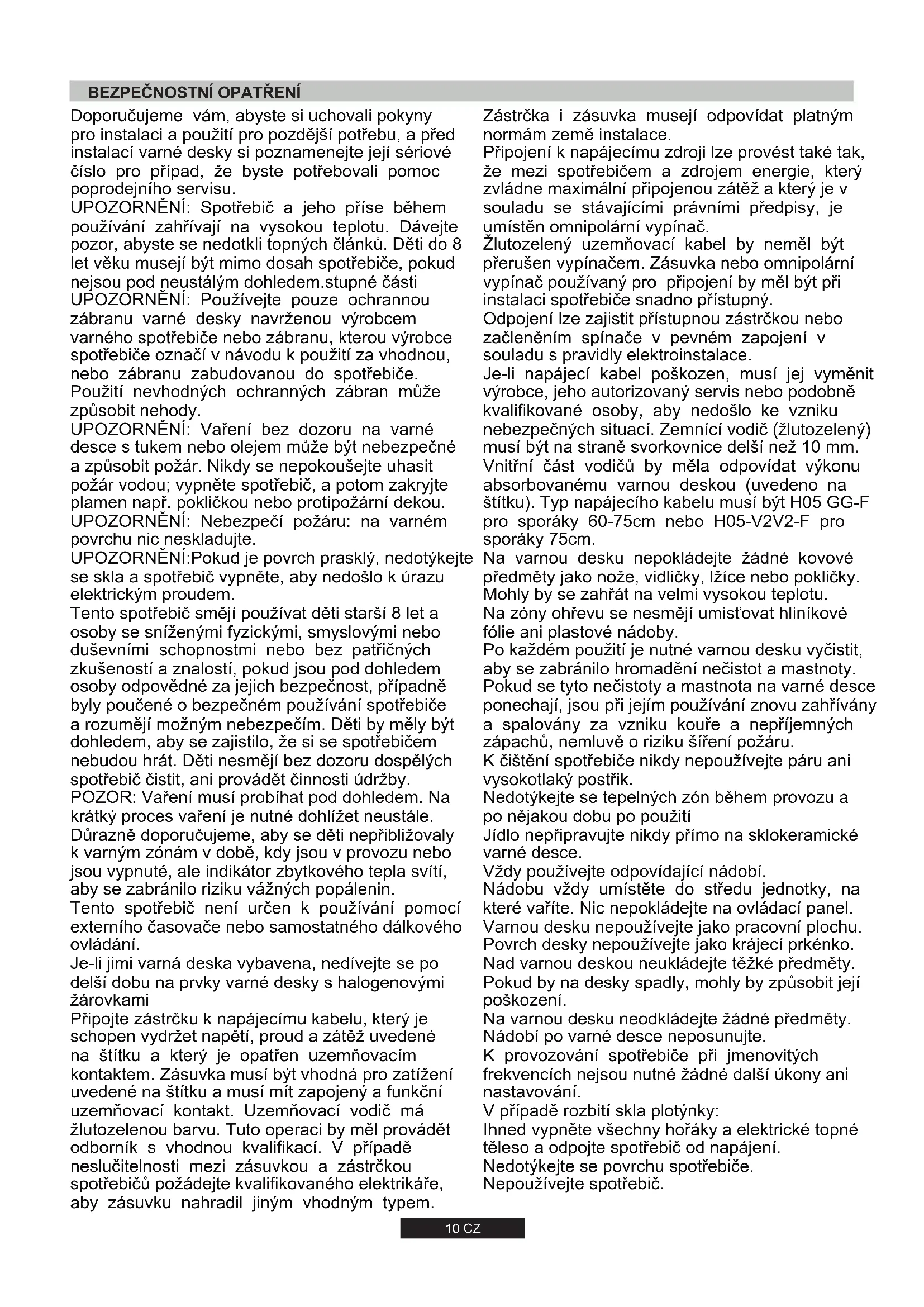 560 g/h 220-240V 50/60Hz -10 CZ Doporučujeme vám, abyste si uchovali pokyny pro instalaci a použití pro pozdější potřebu, a před instalací varné desky si poznamenejte její sériové číslo pro případ, že byste potřebovali pomoc poprodejního servisu. UPOZORNĚNÍ: Spotřebič a jeho příse během používání zahřívají na vysokou teplotu. Dávejte pozor, abyste se nedotkli topných článků. Děti do 8 let věku musejí být mimo dosah spotřebiče, pokud nejsou pod neustálým dohledem.stupné části UPOZORNĚNÍ: Používejte pouze ochrannou zábranu varné desky navrženou výrobcem varného spotřebiče nebo zábranu, kterou výrobce spotřebiče označí v návodu k použití za vhodnou, nebo zábranu zabudovanou do spotřebiče. Použití nevhodných ochranných zábran může způsobit nehody. UPOZORNĚNÍ: Vaření bez dozoru na varné desce s tukem nebo olejem může být nebezpečné a způsobit požár. Nikdy se nepokoušejte uhasit požár vodou; vypněte spotřebič, a potom zakryjte plamen např. pokličkou nebo protipožární dekou. UPOZORNĚNÍ: Nebezpečí požáru: na varném povrchu nic neskladujte. UPOZORNĚNÍ:Pokud je povrch prasklý, nedotýkejte se skla a spotřebič vypněte, aby nedošlo k úrazu elektrickým proudem. Tento spotřebič smějí používat děti starší 8 let a osoby se sníženými fyzickými, smyslovými nebo duševními schopnostmi nebo bez patřičných zkušeností a znalostí, pokud jsou pod dohledem osoby odpovědné za jejich bezpečnost, případně byly poučené o bezpečném používání spotřebiče a rozumějí možným nebezpečím. Děti by měly být dohledem, aby se zajistilo, že si se spotřebičem nebudou hrát. Děti nesmějí bez dozoru dospělých spotřebič čistit, ani provádět činnosti údržby. POZOR: Vaření musí probíhat pod dohledem. Na krátký proces vaření je nutné dohlížet neustále. Důrazně doporučujeme, aby se děti nepřibližovaly k varným zónám v době, kdy jsou v provozu nebo jsou vypnuté, ale indikátor zbytkového tepla svítí, aby se zabránilo riziku vážných popálenin. Tento spotřebič není určen k používání pomocí externího časovače nebo samostatného dálkového ovládání. Je-li jimi varná deska vybavena, nedívejte se po delší dobu na prvky varné desky s halogenovými žárovkami Připojte zástrčku k napájecímu kabelu, který je schopen vydržet napětí, proud a zátěž uvedené na štítku a který je opatřen uzemňovacím kontaktem. Zásuvka musí být vhodná pro zatížení uvedené na štítku a musí mít zapojený a funkční uzemňovací kontakt. Uzemňovací vodič má žlutozelenou barvu. Tuto operaci by měl provádět odborník s vhodnou kvalifikací. V případě neslučitelnosti mezi zásuvkou a zástrčkou spotřebičů požádejte kvalifikovaného elektrikáře, aby zásuvku nahradil jiným vhodným typem.