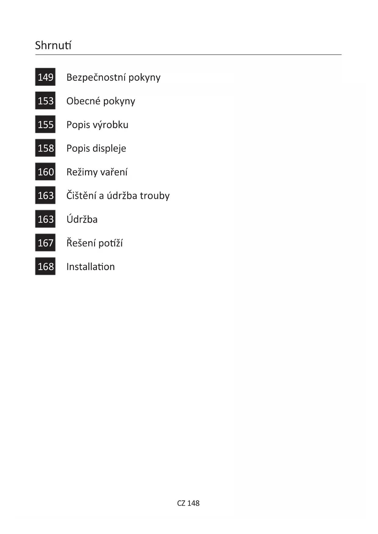 CZ Je-li nábytek v zadní čás vybaven krytem, vy- tvořte otvor pro napájecí kabel. CZ Pokud nemá trouba chladicí venlátor, vyt- vořte otvor. 460 mm x 15 mm.SK 169 Bezpečnostné pokyny Všeobecné pokyny Popis produktu Opis displeja Prevádzkové pokyny Všeobecné informácie o čistení Údržba Riešenie problémov Installaon Obsah