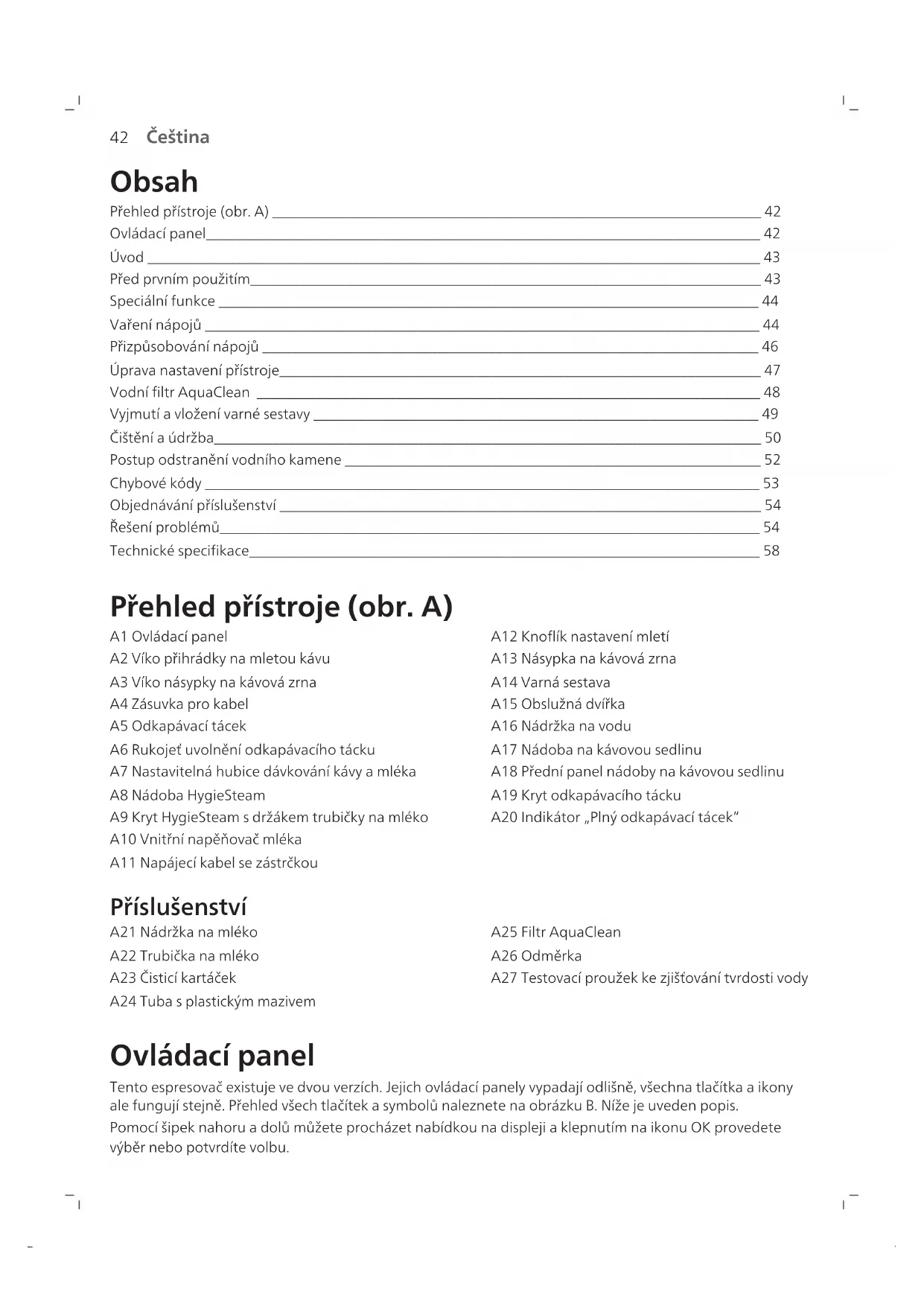 Čeština Obsah Přehled přístroje (obr.A) ___________________________________________________________________ 42 Ovládací panel____________________________________________________________________________ 42 Úvod ____________________________________________________________________________________ 43 Před prvním použitím______________________________________________________________________ 43 Speciální funkce __________________________________________________________________________ 44 Vaření nápojů ____________________________________________________________________________ 44 Přizpůsobování nápojů ____________________________________________________________________ 46 Úprava nastavení přístroje__________________________________________________________________ 47 Vodní filtr AquaClean _____________________________________________________________________ 48 Vyjmutí avložení varné sestavy _____________________________________________________________ 49 Čištění aúdržba___________________________________________________________________________ 50 Postup odstranění vodního kamene _________________________________________________________ 52 Chybové kódy ____________________________________________________________________________ 53 Objednávání příslušenství __________________________________________________________________ 54 Řešení problémů__________________________________________________________________________ 54 Technické specifikace______________________________________________________________________ 58 Přehled přístroje (obr.A) A1 Ovládací panel A2 Víko přihrádky na mletou kávu A3 Víko násypky na kávová zrna A4 Zásuvka pro kabel A5 Odkapávací tácek A6 Rukojeť uvolnění odkapávacího tácku A7 Nastavitelná hubice dávkování kávy a mléka A8 Nádoba HygieSteam A9 Kryt HygieSteam sdržákem trubičky na mléko A10 Vnitřní napěňovač mléka A11 Napájecí kabel se zástrčkou A12 Knoflík nastavení mletí A13 Násypka na kávová zrna A14 Varná sestava A15 Obslužná dvířka A16 Nádržka na vodu A17 Nádoba na kávovou sedlinu A18 Přední panel nádoby na kávovou sedlinu A19 Kryt odkapávacího tácku A20 Indikátor „Plný odkapávací tácek“ Příslušenství A21 Nádržka na mléko A22 Trubička na mléko A23 Čisticí kartáček A24 Tuba splastickým mazivem A25 Filtr AquaClean A26 Odměrka A27 Testovací proužek ke zjišťování tvrdosti vody Ovládací panel Tento espresovač existuje ve dvou verzích. Jejich ovládací panely vypadají odlišně, všechna tlačítka a ikony ale fungují stejně. Přehled všech tlačítek asymbolů naleznete na obrázkuB. Níže je uveden popis. Pomocí šipek nahoru adolů můžete procházet nabídkou na displeji aklepnutím na ikonu OK provedete výběr nebo potvrdíte volbu.43 Čeština B1 Vypínač B2 Přímé ikony nápojů B3 Ikona CoffeeMaestro B4 Nabídka sdalšími nápoji B5 Tlačítko spuštění/zastavení B6 Navigační ikony (nahoru, dolů, zpět, ok) B7 Displej B8 Nastavení přístroje B9 Nabídka čištění B10 Osobní profily Úvod Gratulujeme vám kzakoupení plně automatického kávovaru Saeco! Chcete-li plně využívat online podporu, kterou společnost Saeco nabízí, zaregistrujte si produkt na adrese www.saeco.com/MyCoffeeMachine. Poznámka: Tento přístroj byl zkoušen spoužitím kávy. Ikdyž byl pečlivě vyčištěn, mohly vněm zůstat zbytky kávy. Zaručujeme však, že přístroj je zcela nový. Před prvním použitím