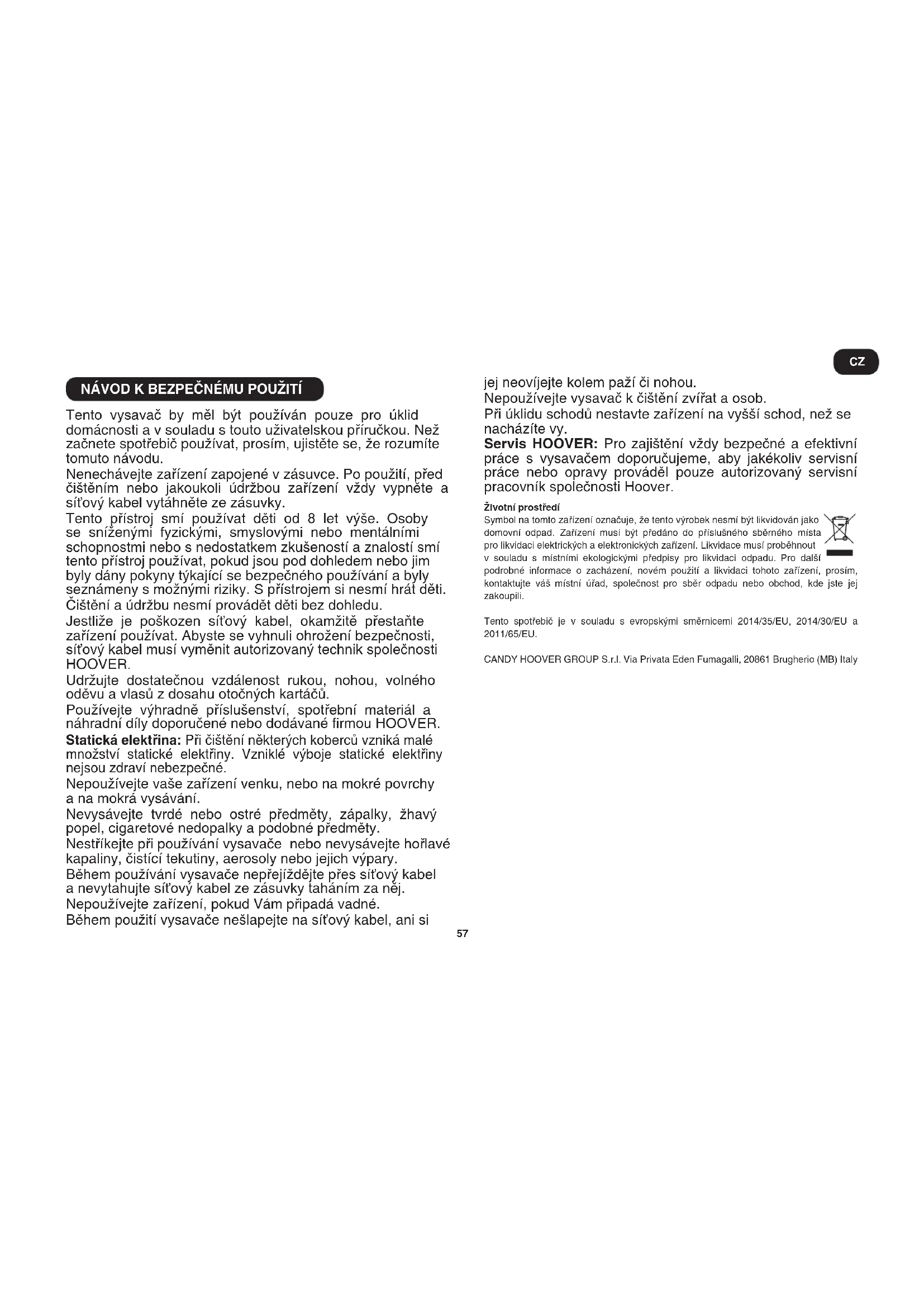 Tento vysavač by měl být používán pouze pro úklid domácnosti a v souladu s touto uživatelskou příručkou. Než začnete spotřebič používat, prosím, ujistěte se, že rozumíte tomuto návodu. Nenechávejte zařízení zapojené v zásuvce. Po použití, před čištěním nebo jakoukoli údržbou zařízení vždy vypněte a síťový kabel vytáhněte ze zásuvky. Tento přístroj smí používat děti od 8 let výše. Osoby se sníženými fyzickými, smyslovými nebo mentálními schopnostmi nebo s nedostatkem zkušeností a znalostí smí tento přístroj používat, pokud jsou pod dohledem nebo jim byly dány pokyny týkající se bezpečného používání a byly seznámeny s možnými riziky. S přístrojem si nesmí hrát děti. Čištění a údržbu nesmí provádět děti bez dohledu. Jestliže je poškozen síťový kabel, okamžitě přestaňte zařízení používat. Abyste se vyhnuli ohrožení bezpečnosti, síťový kabel musí vyměnit autorizovaný technik společnosti HOOVER. Udržujte dostatečnou vzdálenost rukou, nohou, volného oděvu a vlasů z dosahu otočných kartáčů. Používejte výhradně příslušenství, spotřební materiál a náhradní díly doporučené nebo dodávané rmou HOOVER. Statickáelektřina: Při čištění některých koberců vzniká malé množství statické elektřiny. Vzniklé výboje statické elektřiny nejsou zdraví nebezpečné. Nepoužívejte vaše zařízení venku, nebo na mokré povrchy a na mokrá vysávání. Nevysávejte tvrdé nebo ostré předměty, zápalky, žhavý popel, cigaretové nedopalky a podobné předměty. Nestříkejte při používání vysavače nebo nevysávejte hořlavé kapaliny, čistící tekutiny, aerosoly nebo jejich výpary. Během používání vysavače nepřejíždějte přes síťový kabel a nevytahujte síťový kabel ze zásuvky taháním za něj. Nepoužívejte zařízení, pokud Vám připadá vadné. Během použití vysavače nešlapejte na síťový kabel, ani si jej neovíjejte kolem paží či nohou. Nepoužívejte vysavač k čištění zvířat a osob. Při úklidu schodů nestavte zařízení na vyšší schod, než se nacházíte vy. Servis HOOVER: Pro zajištění vždy bezpečné a efektivní práce s vysavačem doporučujeme, aby jakékoliv servisní práce nebo opravy prováděl pouze autorizovaný servisní pracovník společnosti Hoover. Životníprostředí Symbol na tomto zařízení označuje, že tento výrobek nesmí být likvidován jako domovní odpad. Zařízení musí být předáno do příslušného sběrného místa pro likvidaci elektrických a elektronických zařízení. Likvidace musí proběhnout v souladu s místními ekologickými předpisy pro likvidaci odpadu. Pro další podrobné informace o zacházení, novém použití a likvidaci tohoto zařízení, prosím, kontaktujte váš místní úřad, společnost pro sběr odpadu nebo obchod, kde jste jej zakoupili. Tento spotřebič je v souladu s evropskými směrnicemi 2014/35/EU, 2014/30/EU a 2011/65/EU. CANDY HOOVER GROUP S.r.l. Via Privata Eden Fumagalli, 20861 Brugherio (MB) Italy CZ58